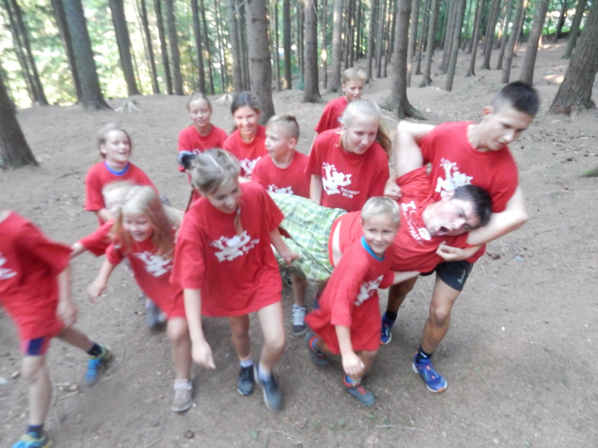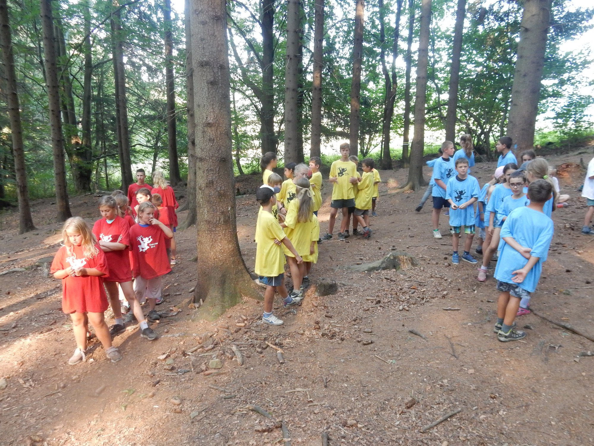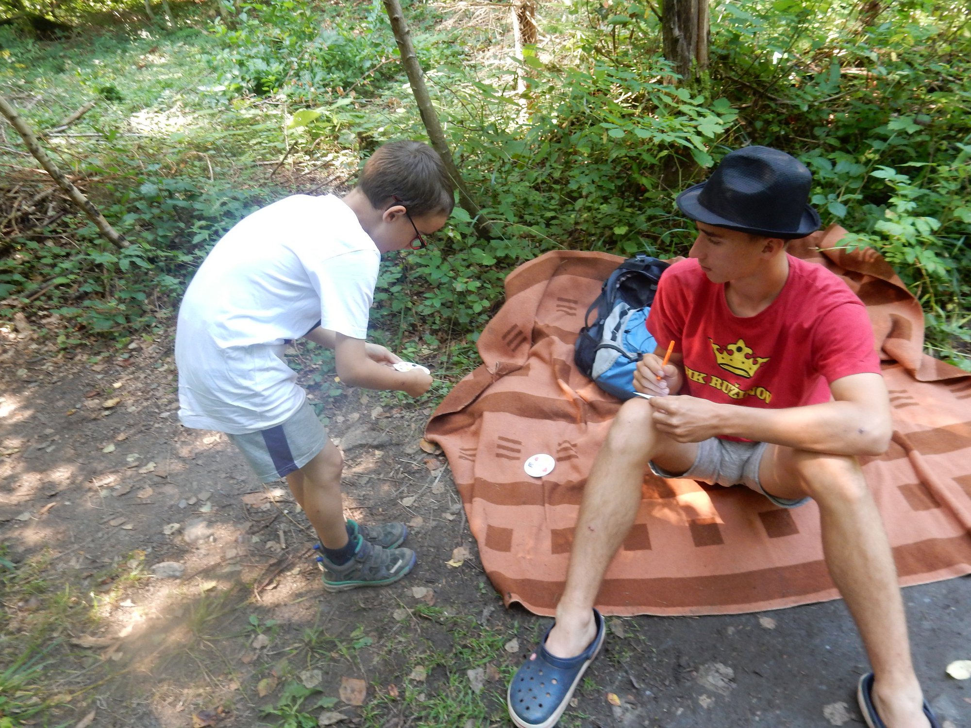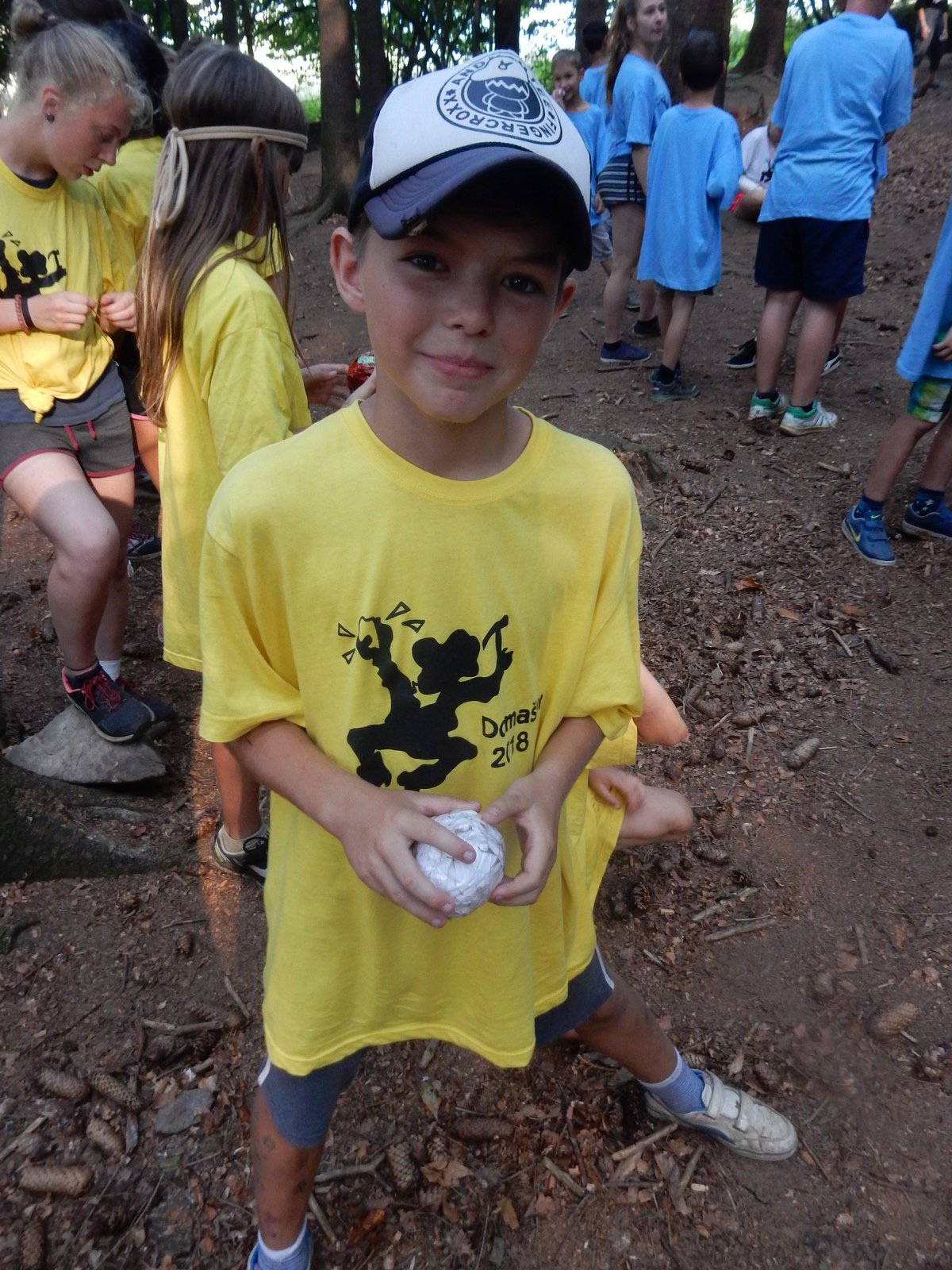 Dnes dopoledne běháme závod jednotlivců inspirovaný hrou Dobble. Mladší běželi s kartičkou a na každém stanovišti museli co nejrychleji najít stejný obrázek. Starší měli hru ztíženou – běželi bez kartičky a museli si obrázky mezi stanovišti pamatovat. Kdo si lépe pamatoval, méně se naběhal. Party, které zrovna neběžely závod jednotlivců, se utkaly v mezioddílových kláních. Protože se včerejší celotáborový Maršál a špion líbil, všichni si i pro dnešní souboje vybrali tuto oblíbenou hru.