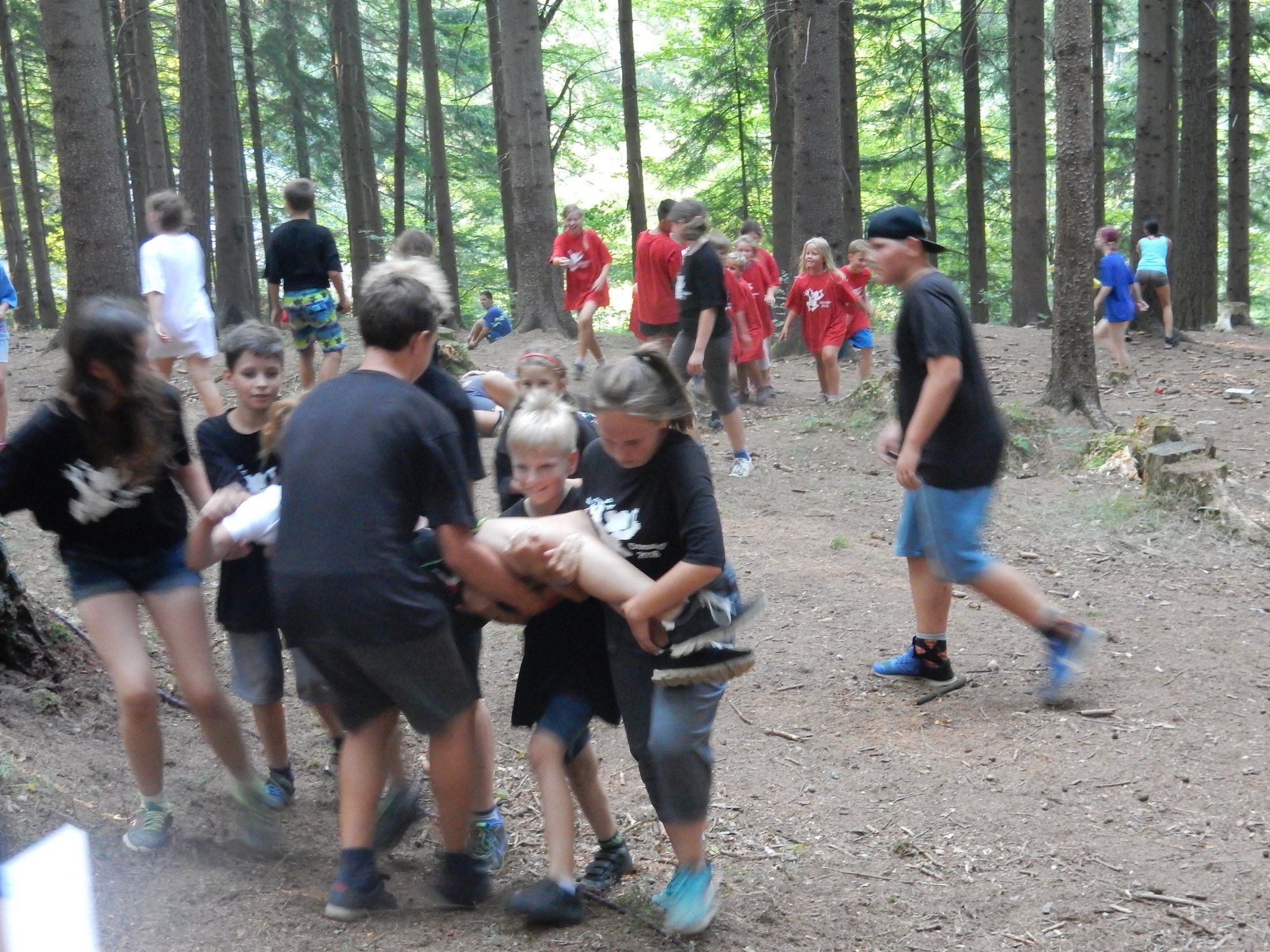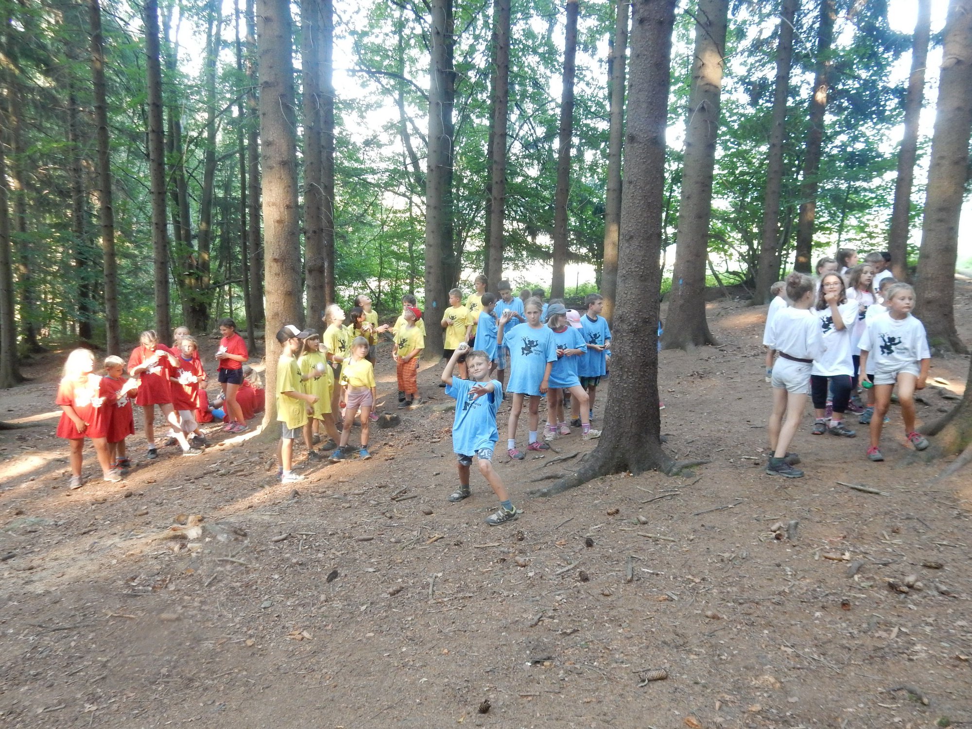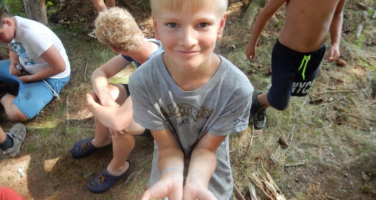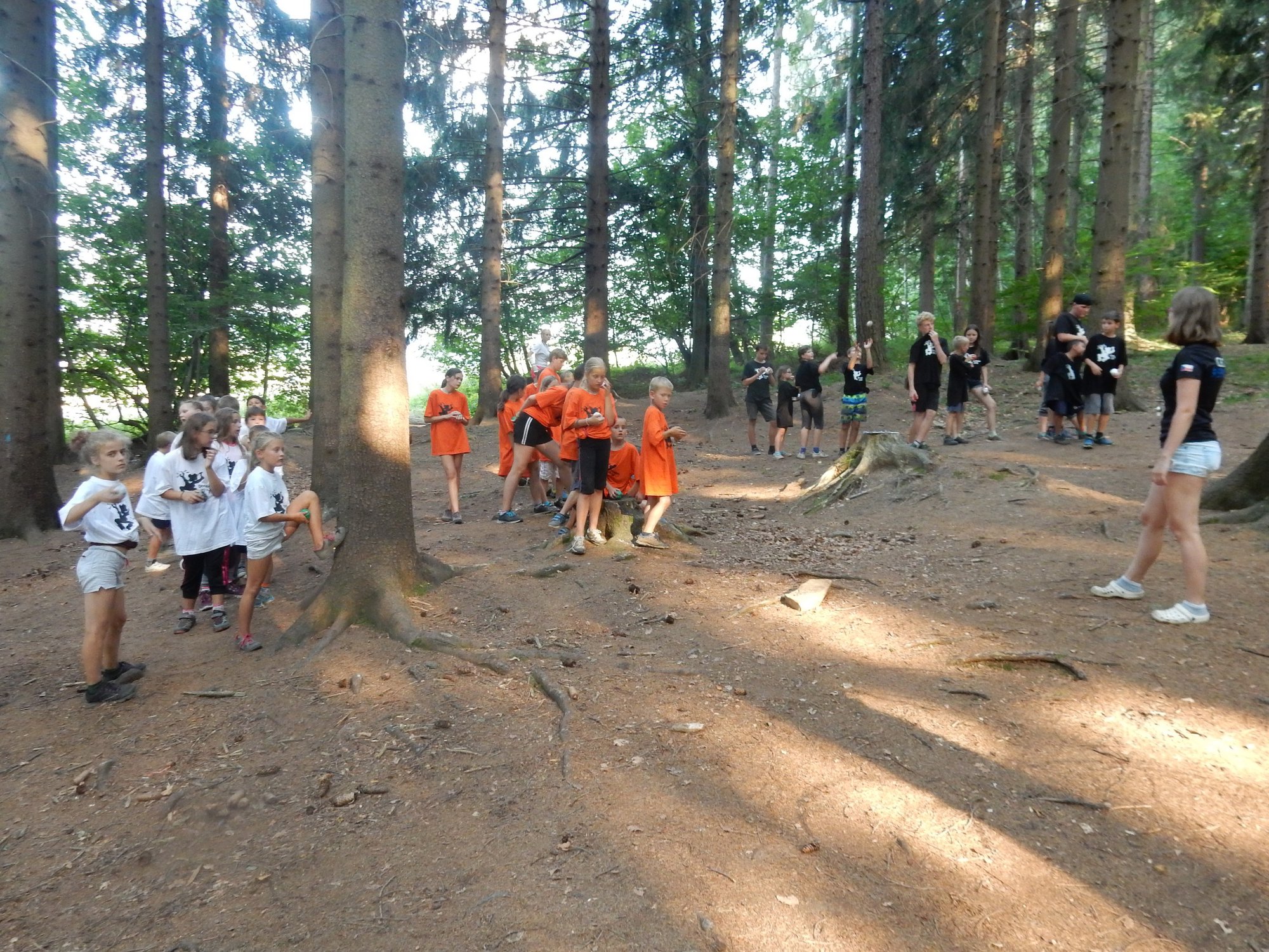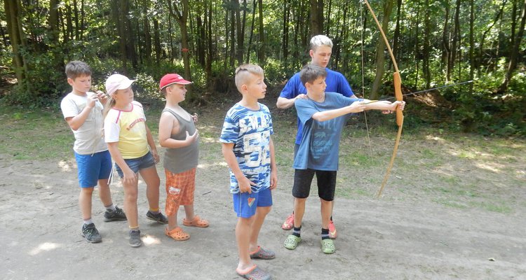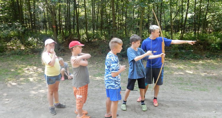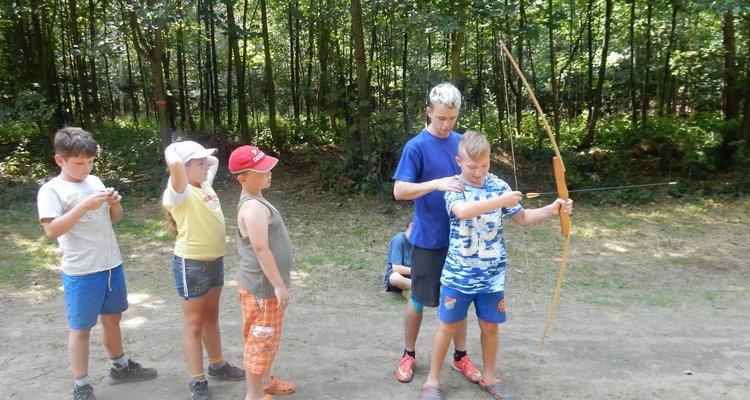 V poledním klidu jsme dnes potrénovali lukostřelbu. Kdo chtěl, mohl si přijít mimo soutěž zastřílet. Jako vždy jsme také vytěžili dnešní naleziště zlata a stříbra. Před svačinou byla rychlovka, ve které jsme měli a úkol po táboře najít různá slova a poskládat z nich příběh. Hlavní odpolední hrou byl lov bizonů. Ti byli představováni našimi vedoucími, my jsme se proměnili v lovce vyzbrojené papírovými koulemi. Museli jsme bizona zasáhnout a zároveň se od něho nenechat chytit. Když byla kořist skolena, ještě jsme ji museli dotáhnout na určené místo. Vrátili jsme se do tábora a už zase si hrajeme s míčem :-)