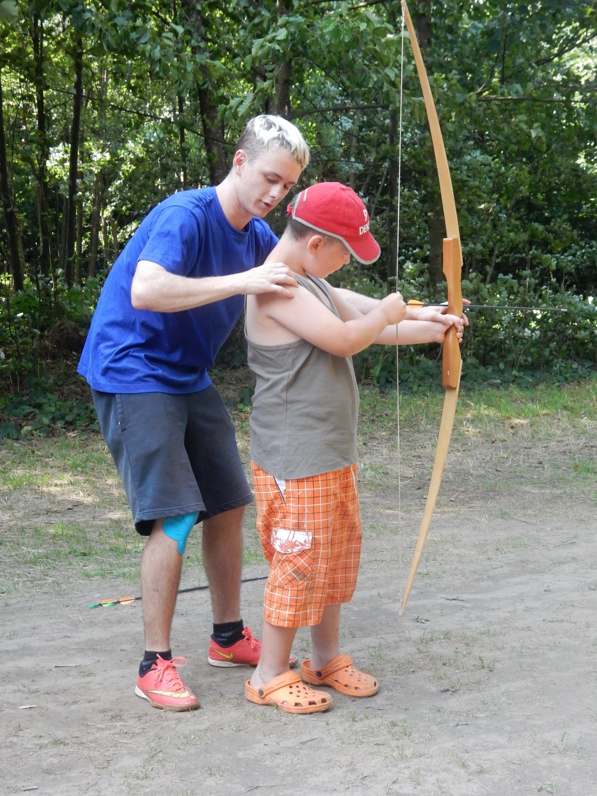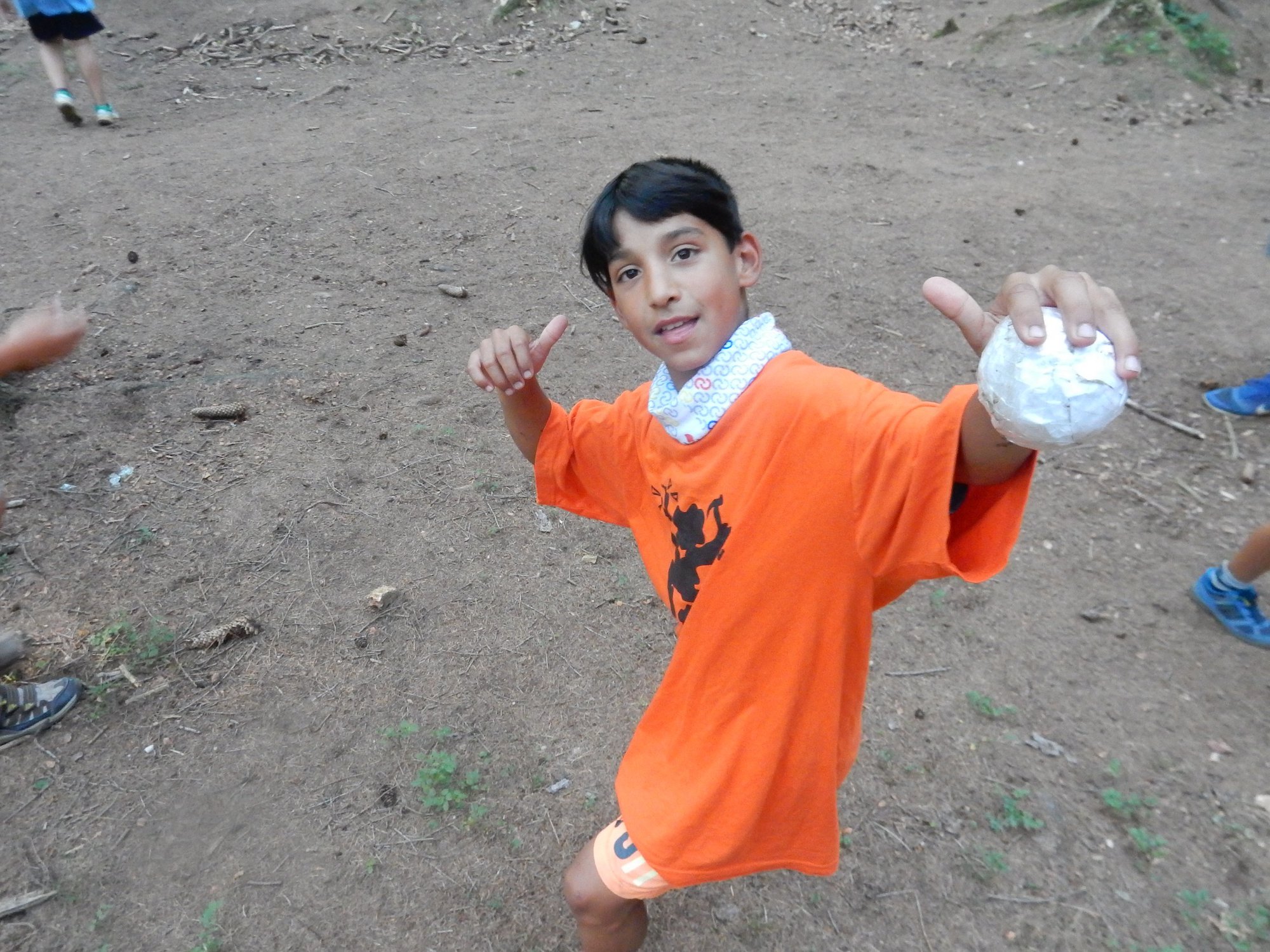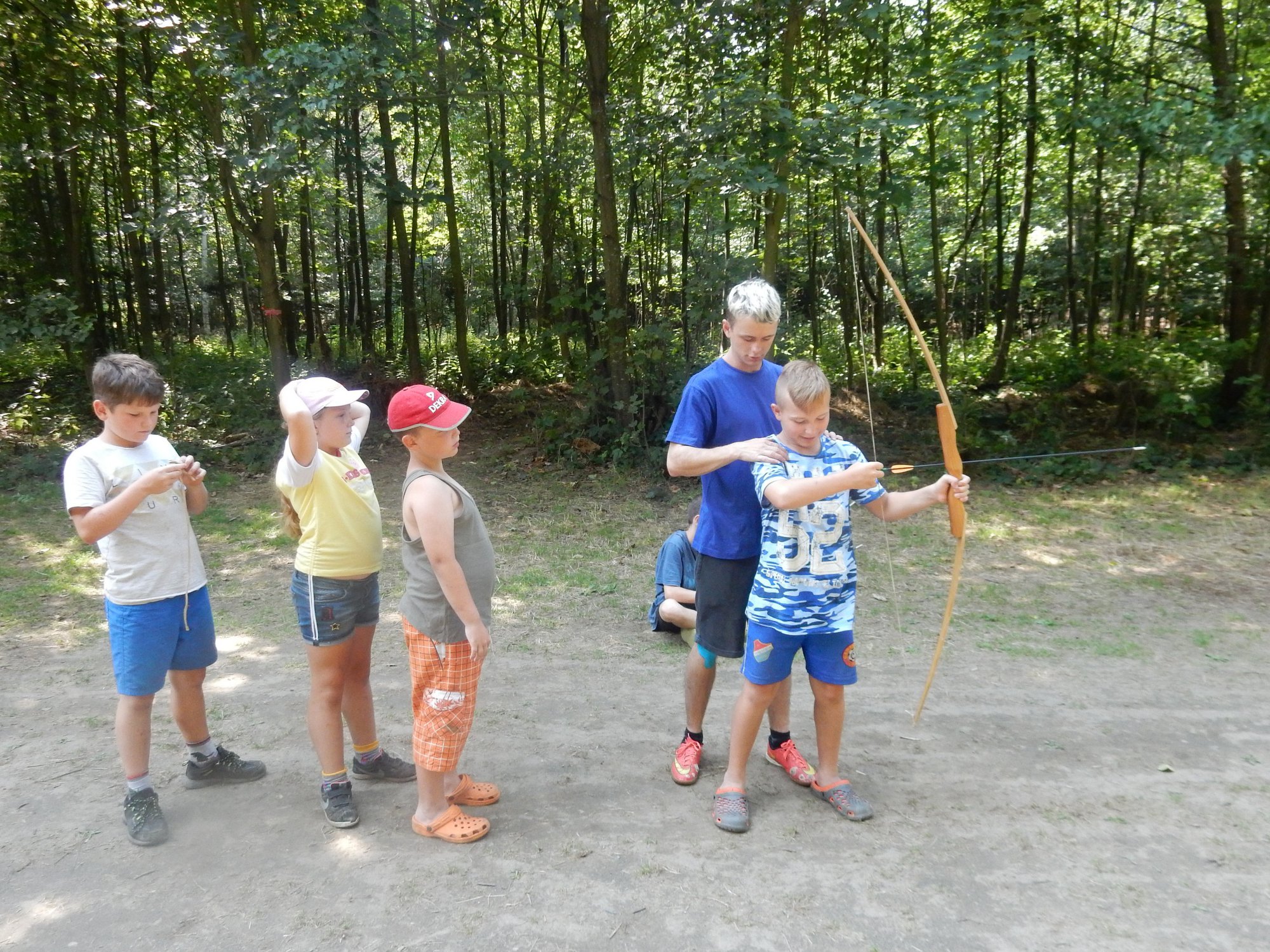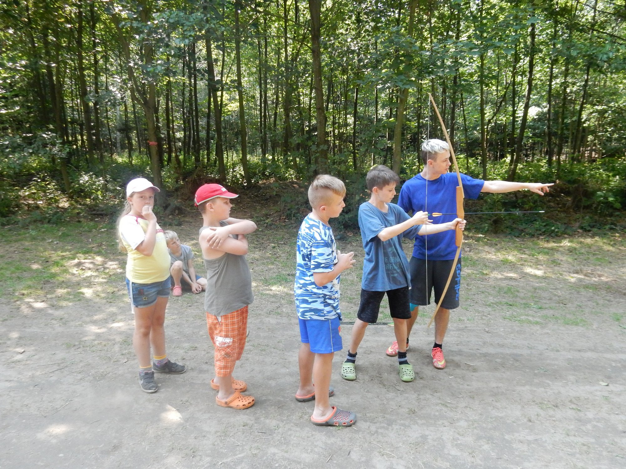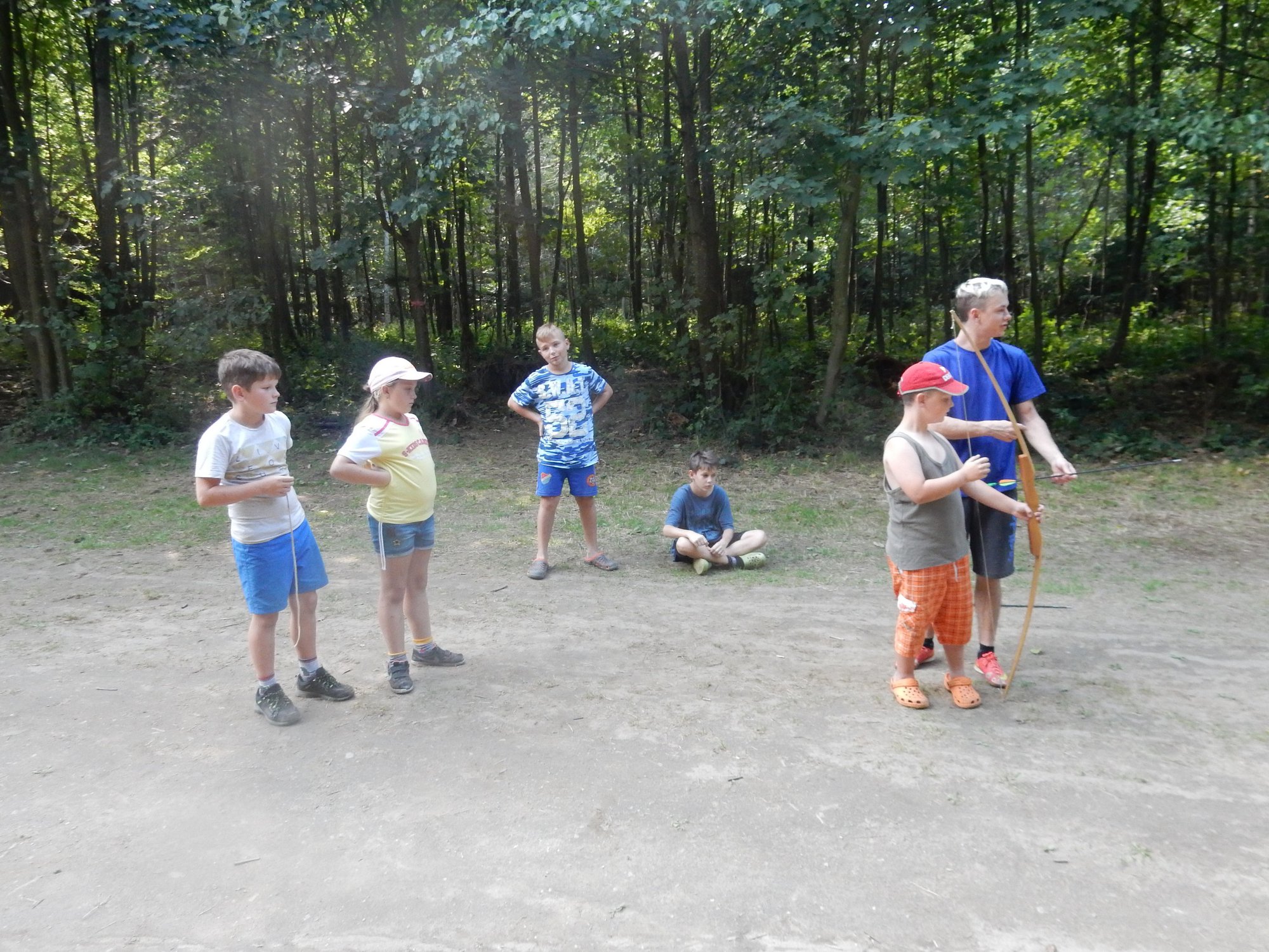 V poledním klidu jsme dnes potrénovali lukostřelbu. Kdo chtěl, mohl si přijít mimo soutěž zastřílet. Jako vždy jsme také vytěžili dnešní naleziště zlata a stříbra. Před svačinou byla rychlovka, ve které jsme měli a úkol po táboře najít různá slova a poskládat z nich příběh. Hlavní odpolední hrou byl lov bizonů. Ti byli představováni našimi vedoucími, my jsme se proměnili v lovce vyzbrojené papírovými koulemi. Museli jsme bizona zasáhnout a zároveň se od něho nenechat chytit. Když byla kořist skolena, ještě jsme ji museli dotáhnout na určené místo. Vrátili jsme se do tábora a už zase si hrajeme s míčem :-)