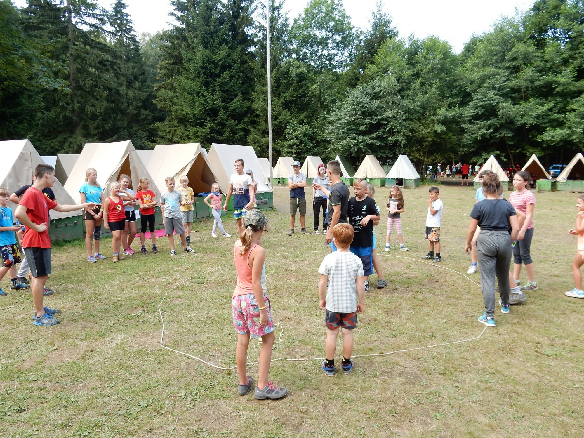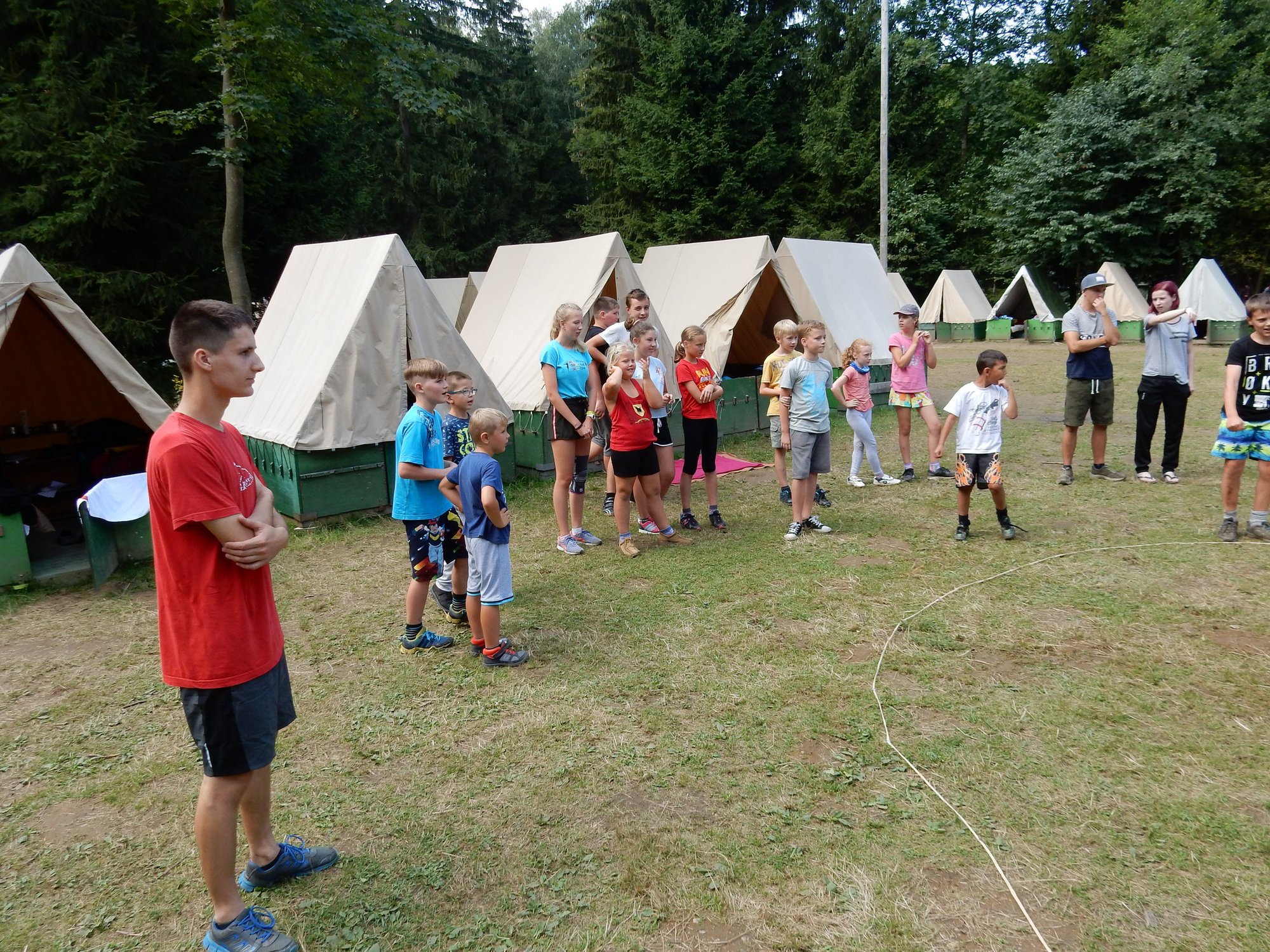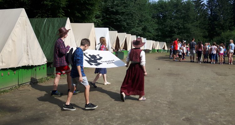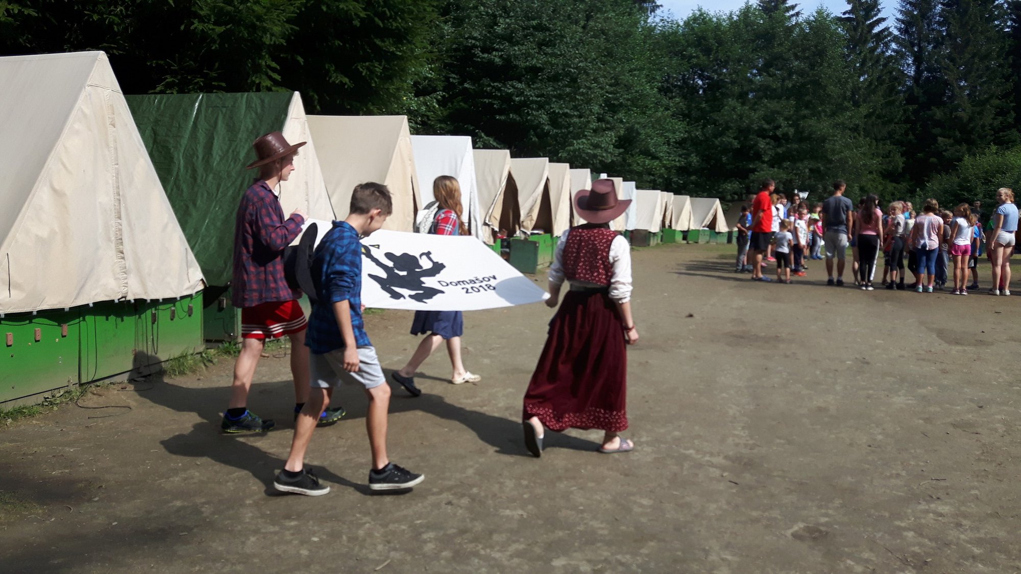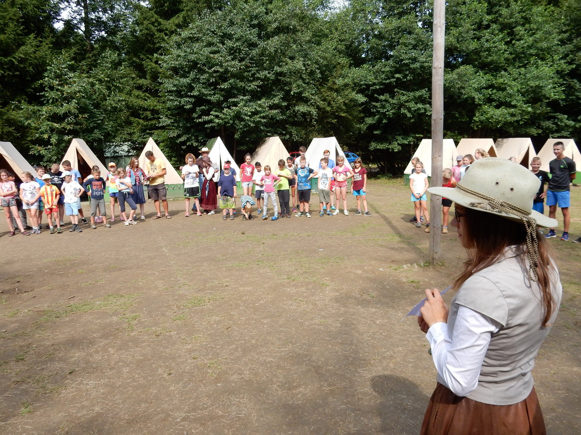První táborovou noc jsme všichni přečkali bez problémů. Jak už to první den bývá, ještě před budíčkem už bylo připraveno spousta zlatokopů do akce. Počasí nám přálo a tak jsme se po snídani (chleba s vajíčkovou pomazánkou a pažitkou) vydali prohlédnout si širší okolí tábora. Na nástupu jsme vztyčili vlajku a dozvěděli se první informace o letošní celotáborové hře. Během dne se ještě seznámíme s mapou a s tím, jak na ní budeme postupovat. Ve zbytku dopoledne poměříme síly v kláních mezi našimi partami.