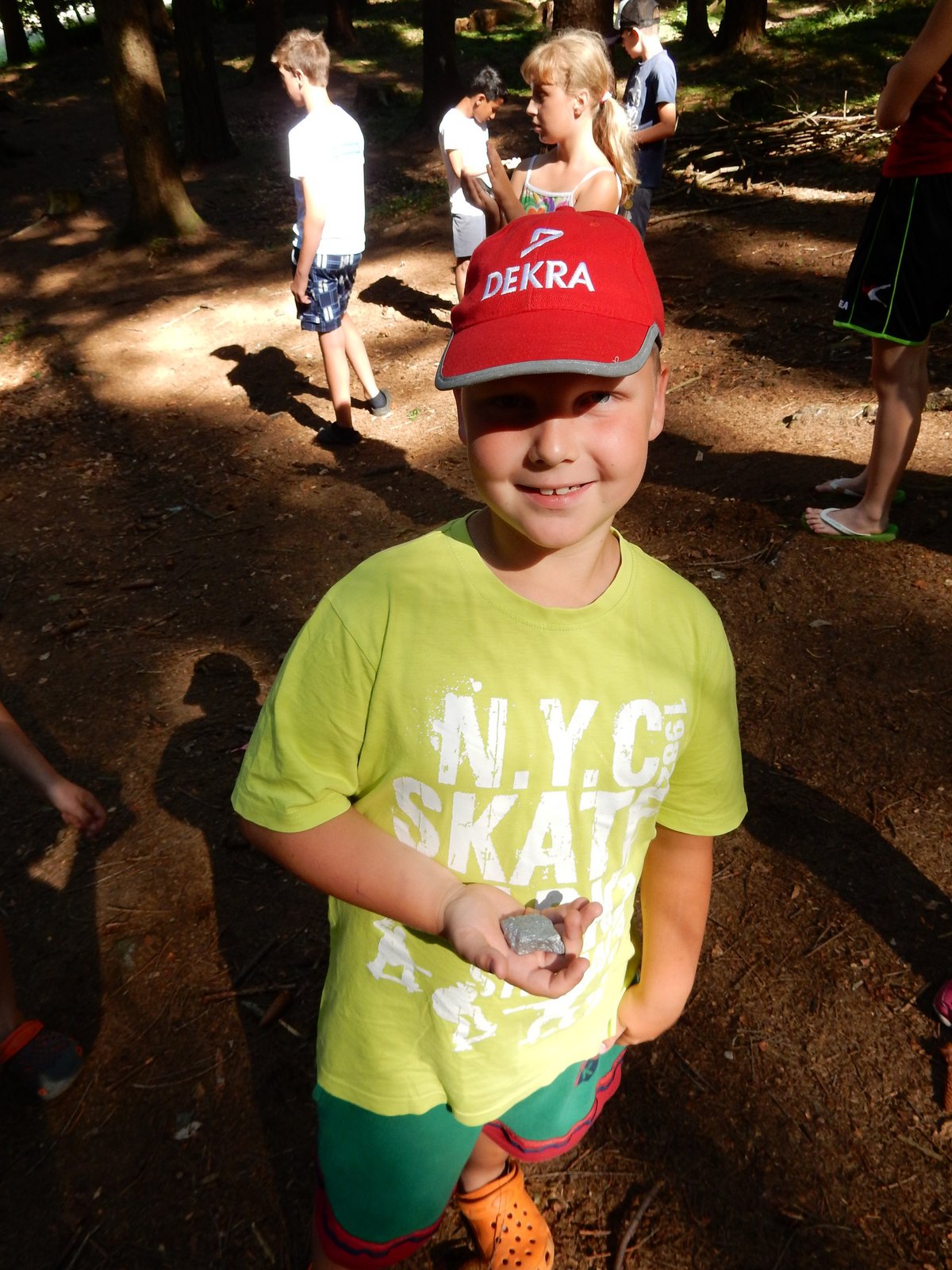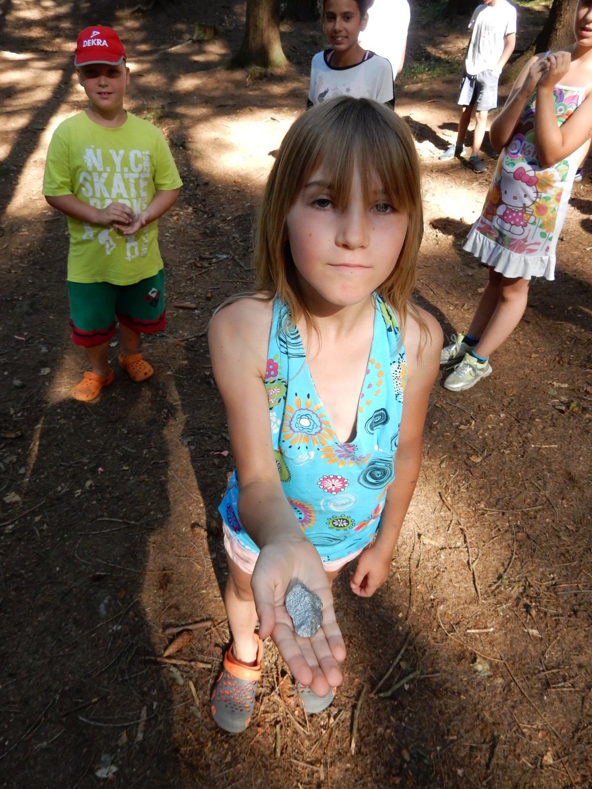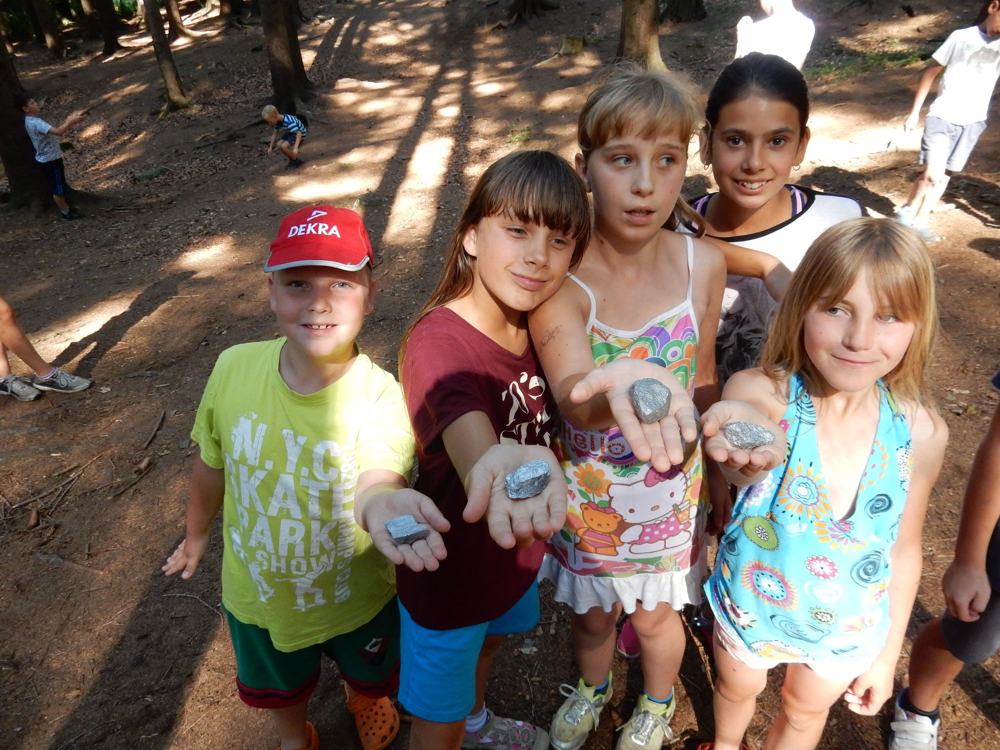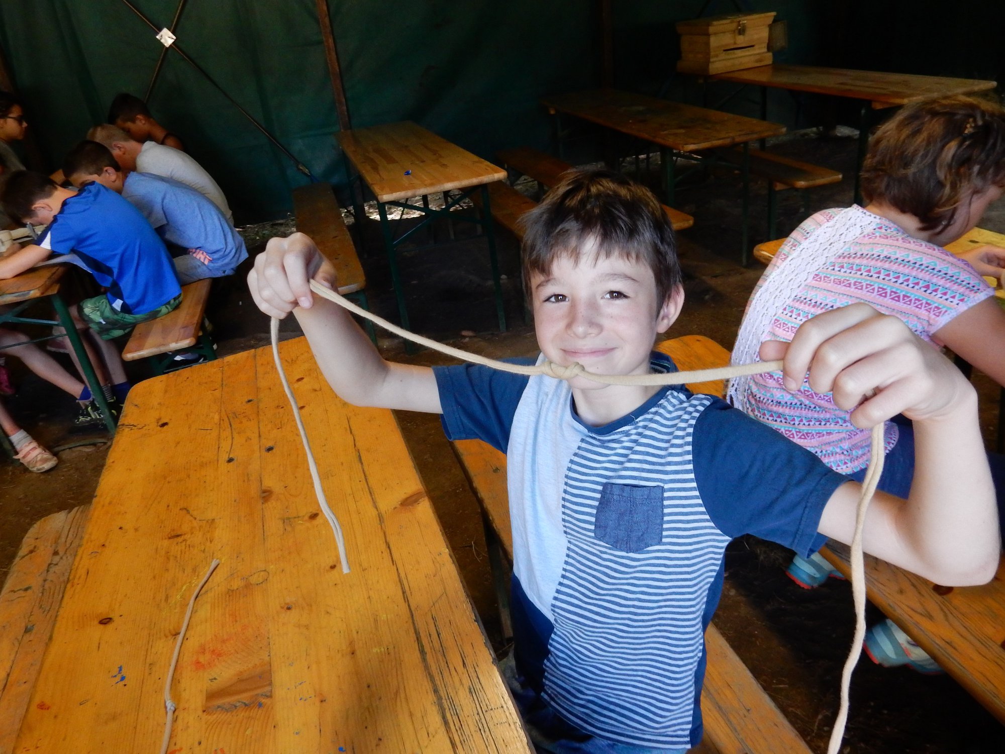 Z dopoledního klidu nás náhle vyrušilo volání a shon. Vždy jeden z nejstarších zlatokopů dostal za úkol svolat svůj oddíl a vyrazit do lesa najít a složit kousky tajné zprávy. Ta nás po vyluštění poslala na různá místa v okolí tábora, kde se měla nacházet truhla s pokladem. Truhlu jsme našli a byla v ní pro každý oddíl jen malá drobnost. Tak jednoduché to zase s hledáním zlata být nemůže, ale my se nevzdáváme a budeme hledat dál ! Ve zbytku dopoledne jsme se učili vázat uzly, zpívali s kytarou a podobné lehčí zaměstnání. Každý se do něčeho zapojil. Po obědě si dopřejeme polední klid a protože je koupací počasí, plánujeme se jít vykoupat.