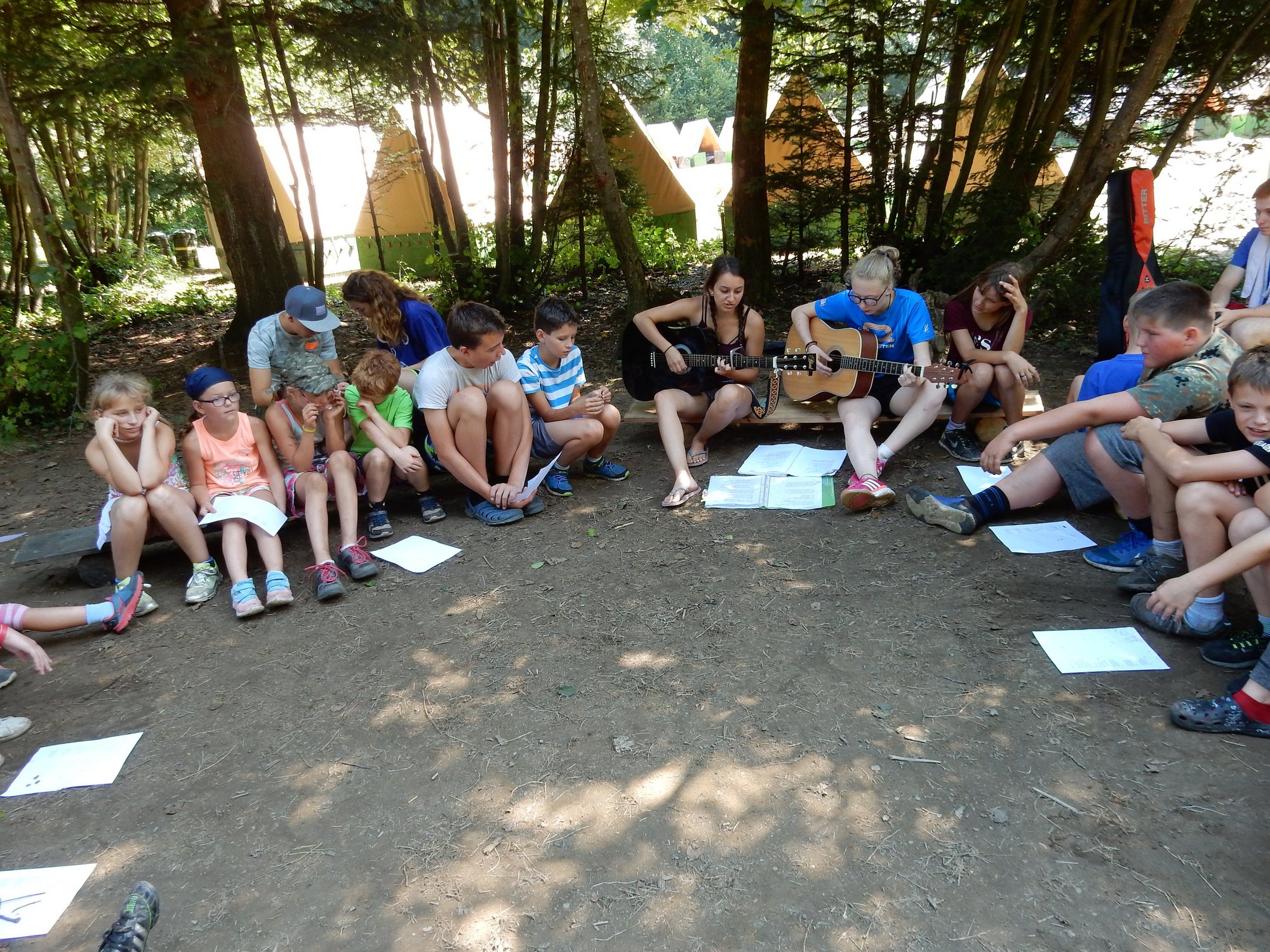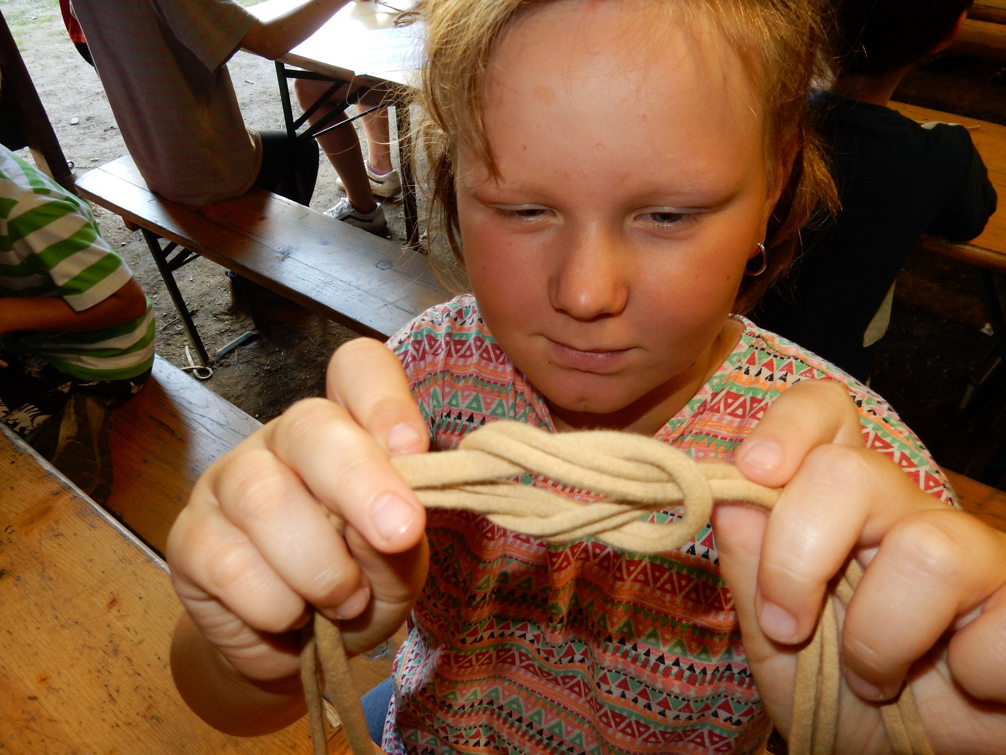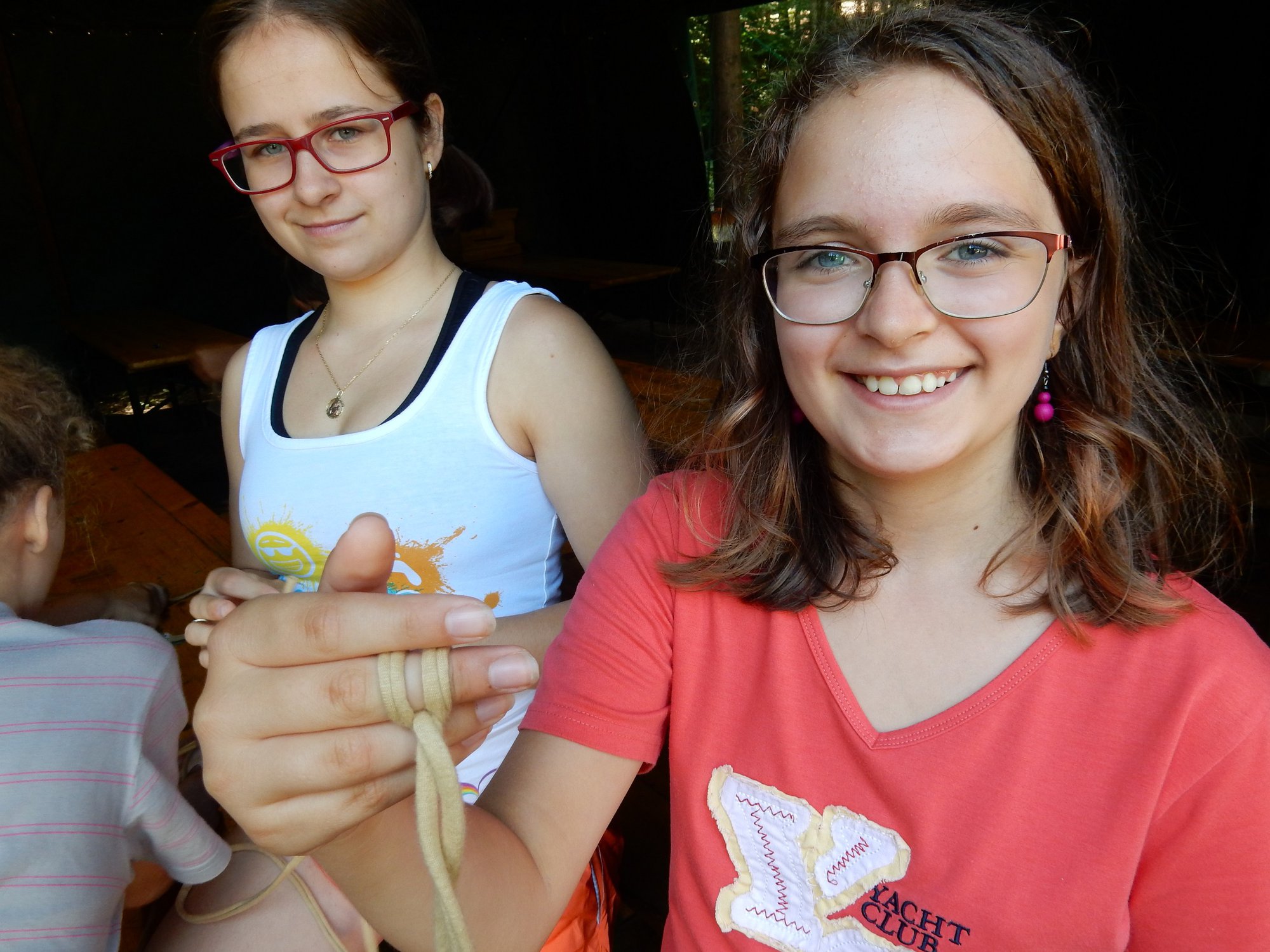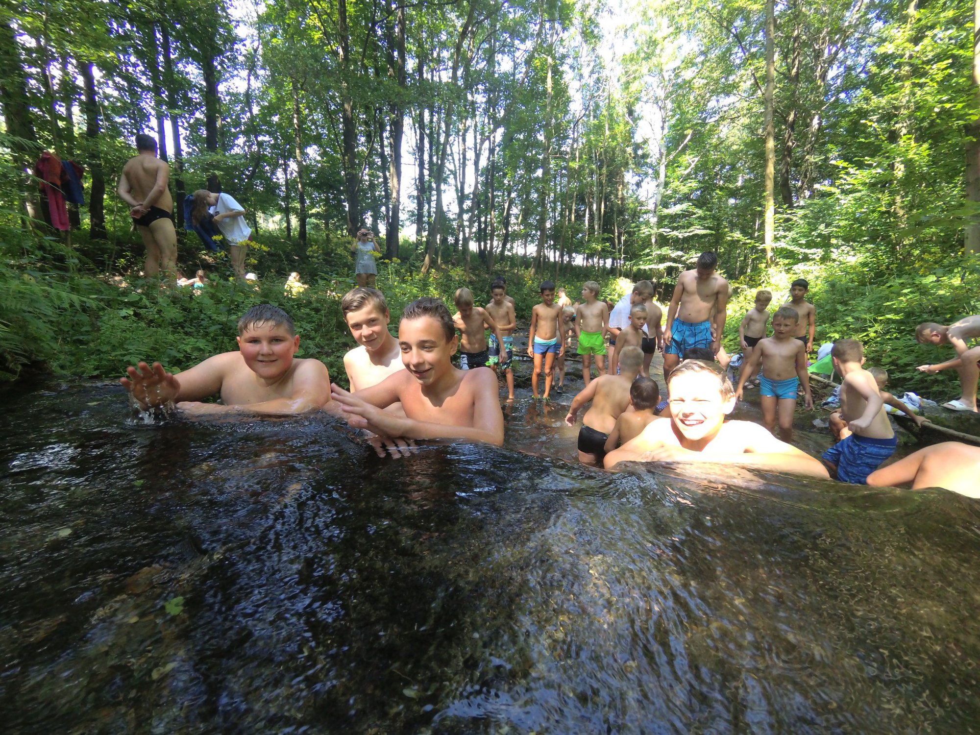 Z dopoledního klidu nás náhle vyrušilo volání a shon. Vždy jeden z nejstarších zlatokopů dostal za úkol svolat svůj oddíl a vyrazit do lesa najít a složit kousky tajné zprávy. Ta nás po vyluštění poslala na různá místa v okolí tábora, kde se měla nacházet truhla s pokladem. Truhlu jsme našli a byla v ní pro každý oddíl jen malá drobnost. Tak jednoduché to zase s hledáním zlata být nemůže, ale my se nevzdáváme a budeme hledat dál ! Ve zbytku dopoledne jsme se učili vázat uzly, zpívali s kytarou a podobné lehčí zaměstnání. Každý se do něčeho zapojil. Po obědě si dopřejeme polední klid a protože je koupací počasí, plánujeme se jít vykoupat.
