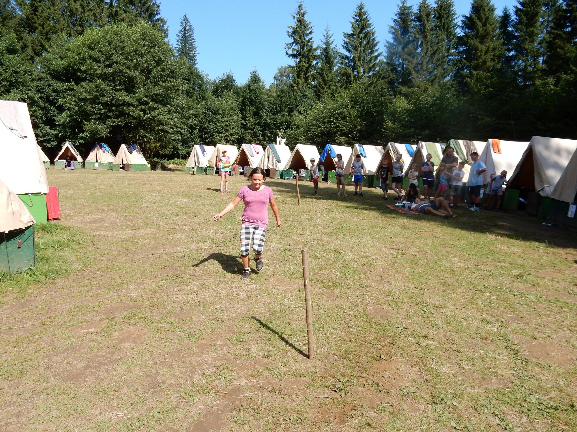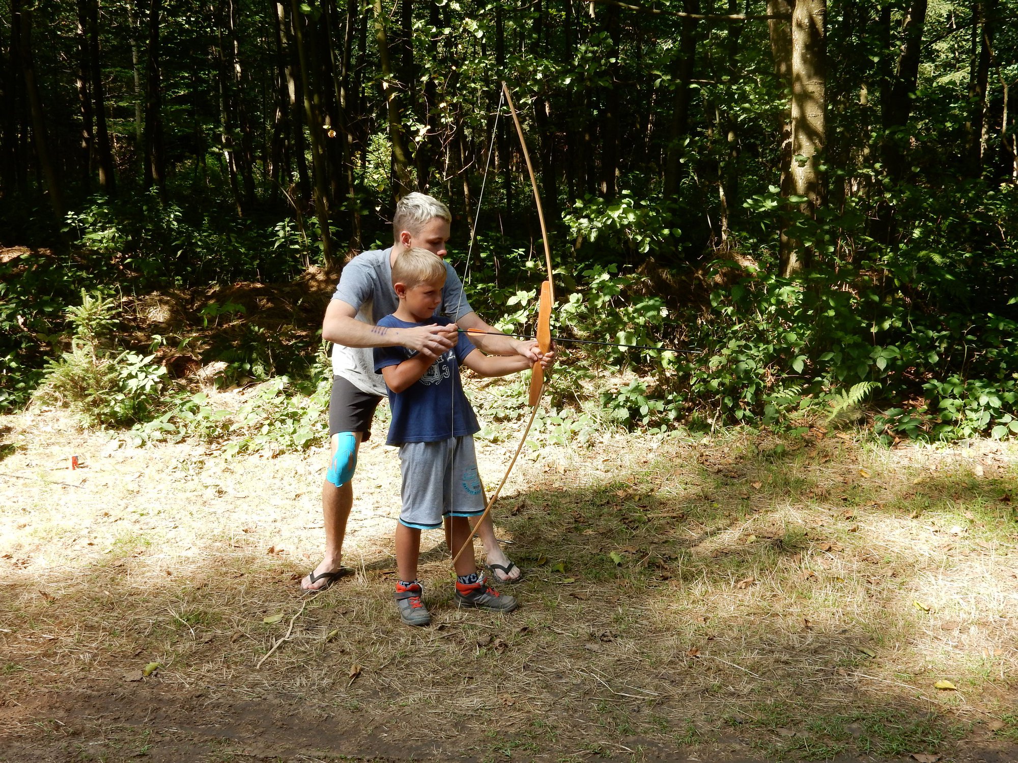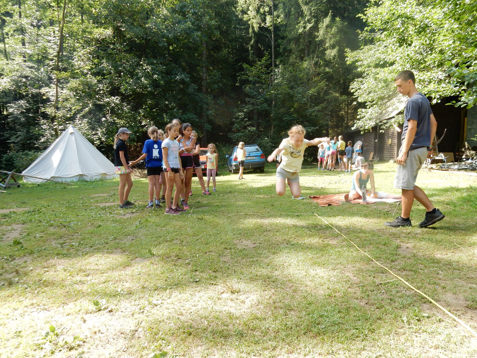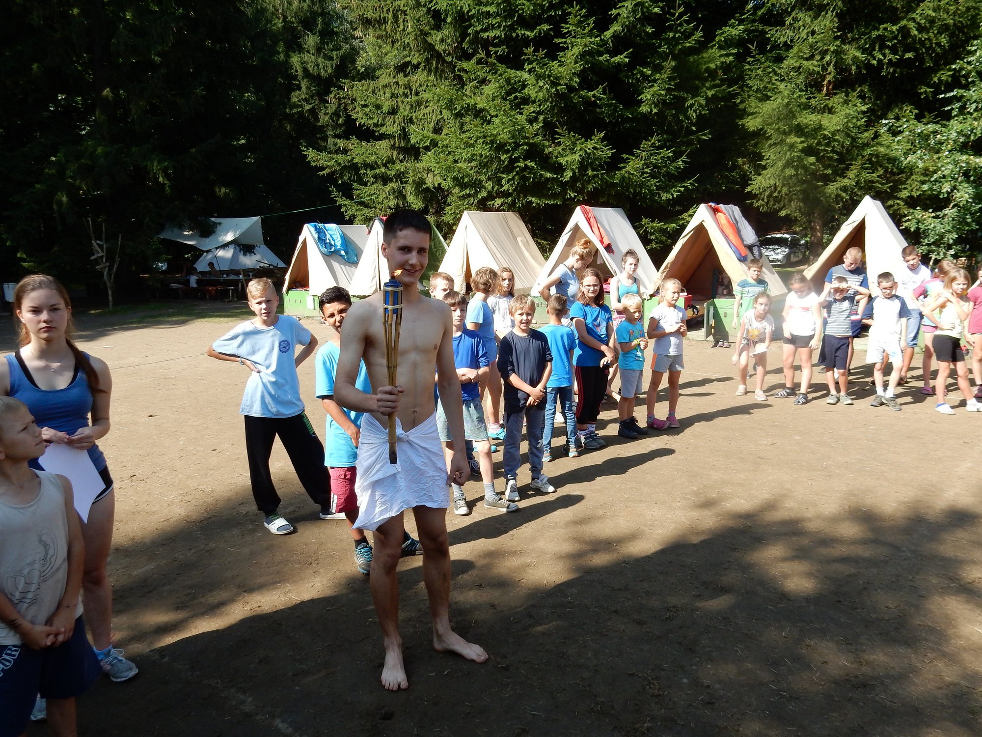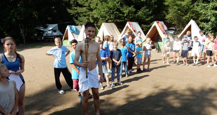 Po včerejší noční hře jsme měli budíček až v 8 a probudili jsme se do dalšího slunečného dne. Po včerejší bitvě jsme dnes pro změnu tužili přátelství a uspořádali jsme tábornické olympijské hry. Zahájení obstaral atlet s pochodní a po něm jsme se rozprchli po disciplínách. Kromě člunkového běhu, podhmatu a skoku dalekého jsme měli možnost si zastřílet z luku, ze vzduchovky a zaházet šipkami. To všechno se nám na divokém západě bude hodit každý den. Na každou disciplínu můžeme jít třikrát, takže až do oběda budeme zlepšovat své výkony, abychom se vám mohli pochlubit prvními diplomy.