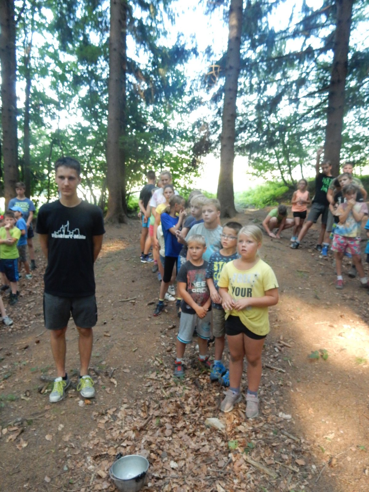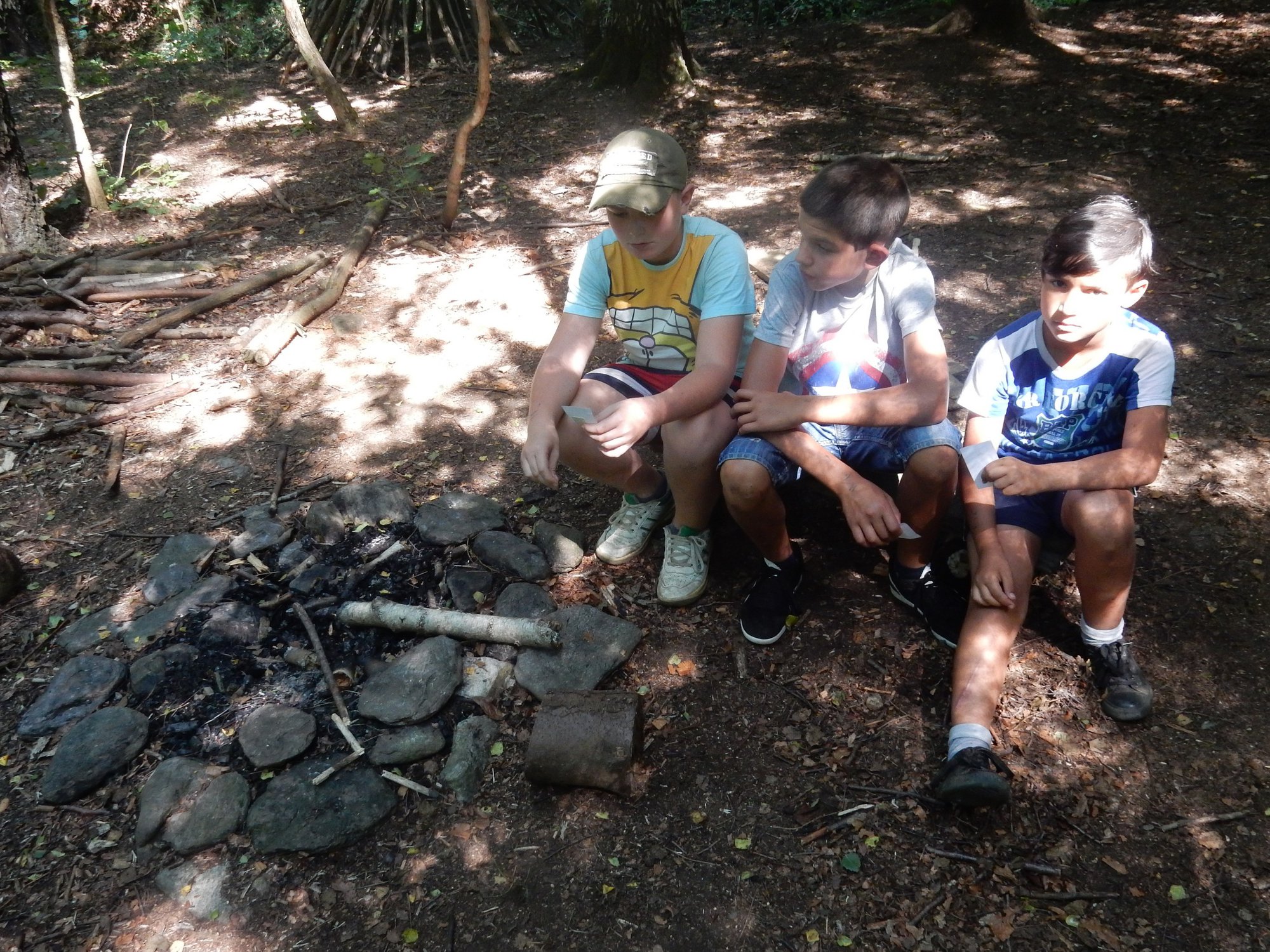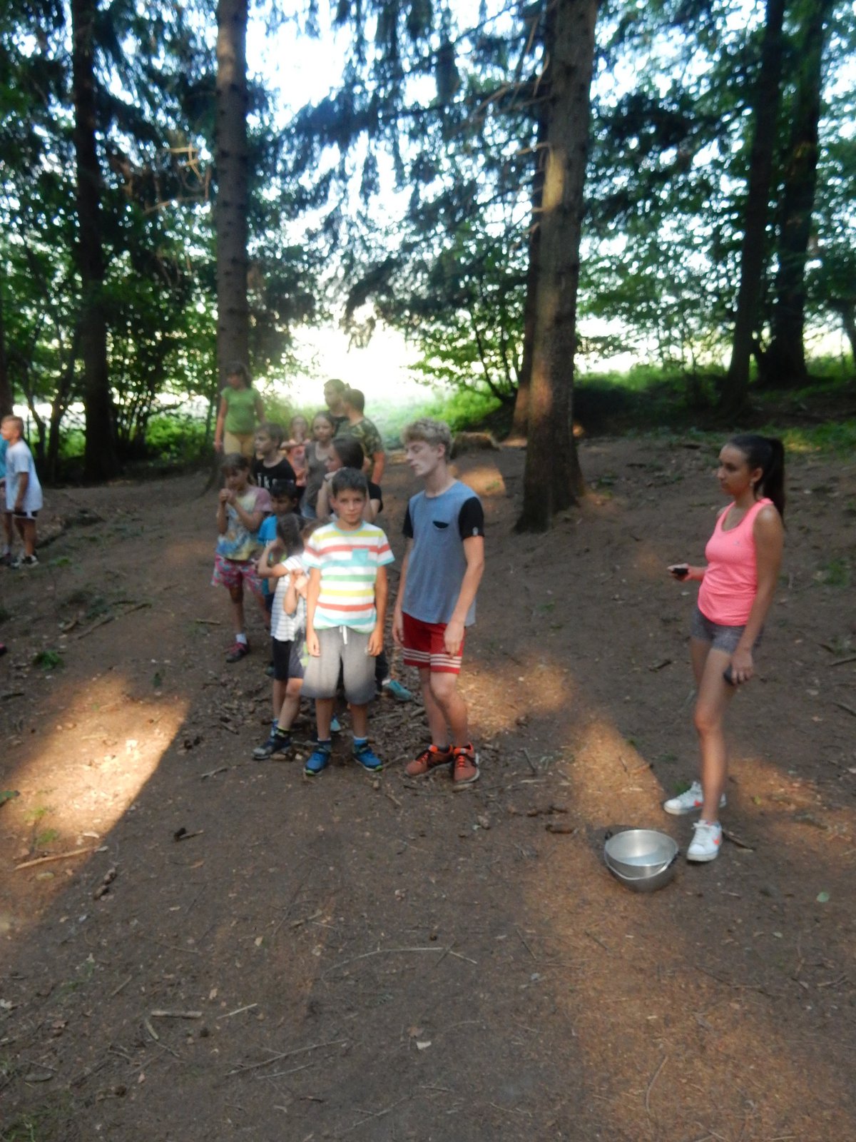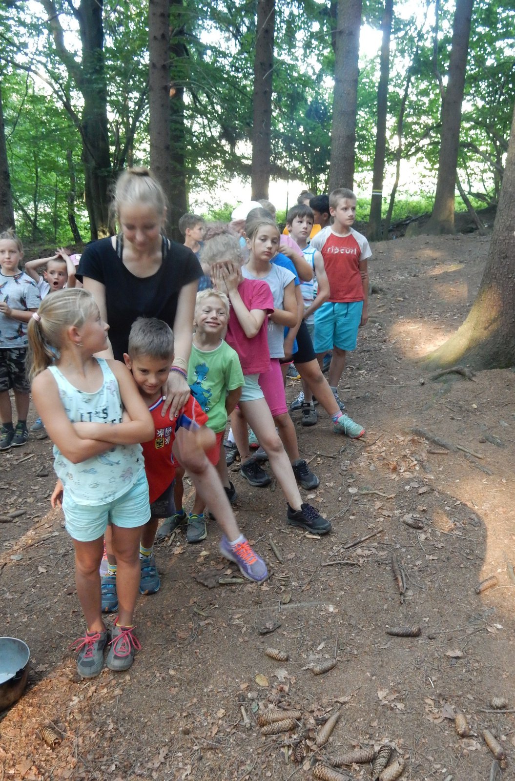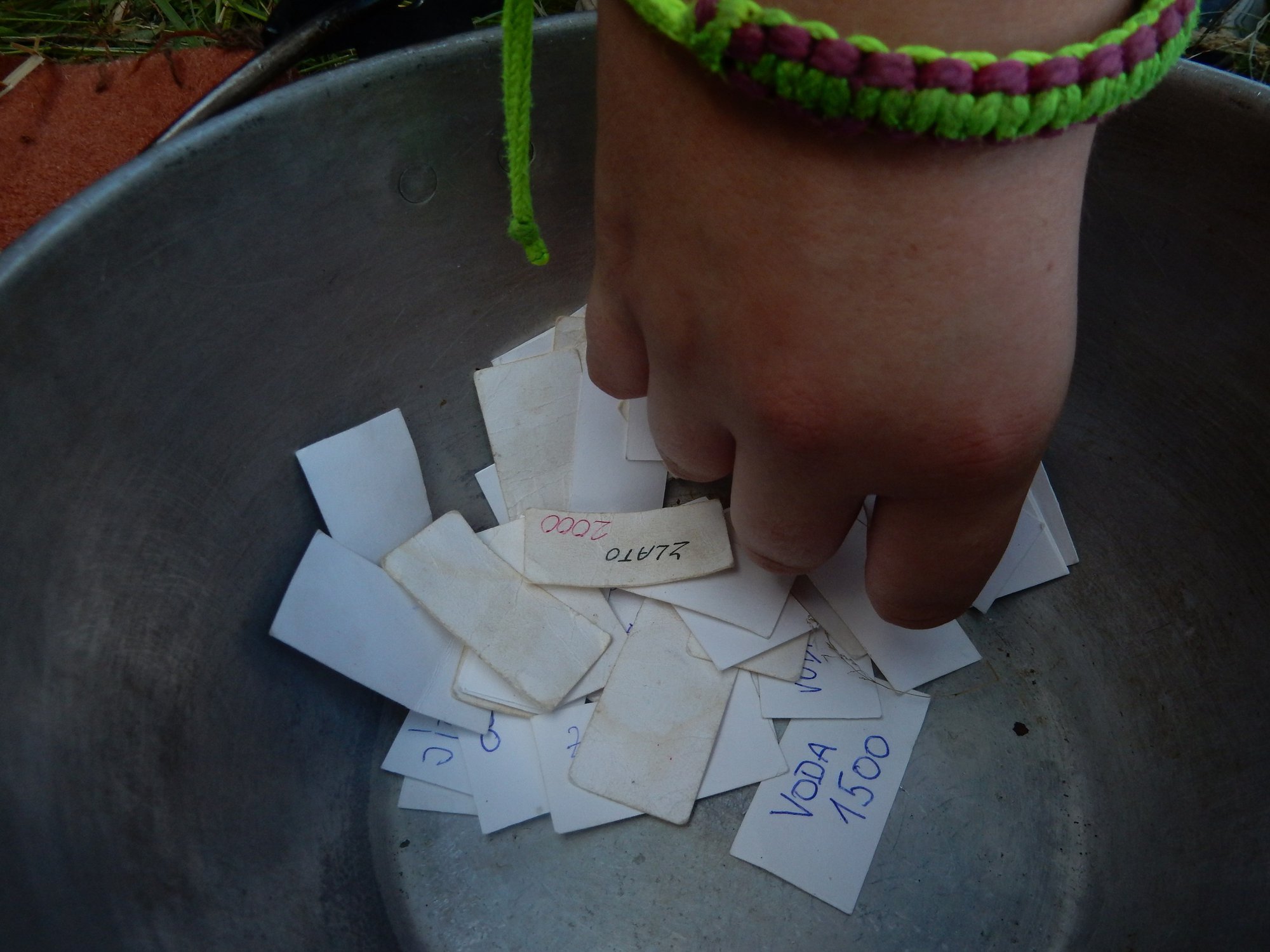Ráno jsme poslali z každé party dvojici na pomoc kuchyni se škrábáním brambor (takže to po nás můžete chtít i doma :-)). Před svačinou jsme si zahráli po táboře rychlovku na otestování naší pozornost, jak si všímáme věcí po táboře. Na nástupu jsme se dozvěděli, že při dopravě zboží do našich osad škodí neznámě tlupy banditů. Museli jsme napnout všechny síly a pomoci dopravit zboží do určených míst. Hrálo se v celém širokém okolí tábora. Aby to nebylo tak jednoduché, cestou nás přepadávali bandité (naši vedoucí) a snažili se nás oloupit. I tak jsme přepravili úctyhodnou hromadu zboží. Z dřívějších her a výprav známe kdejakou cestičku a to nám dnes hodně pomohlo.