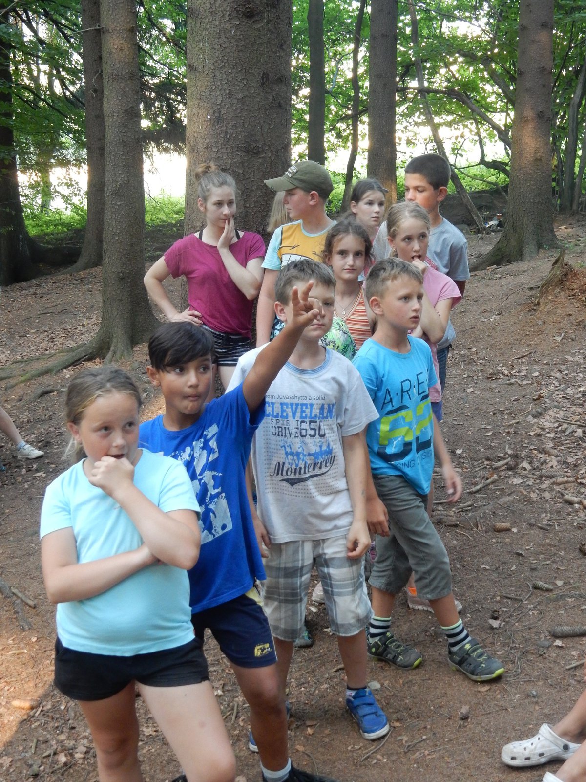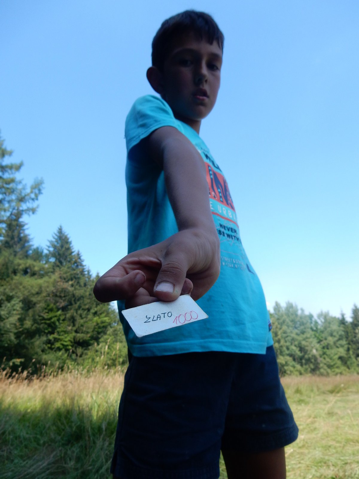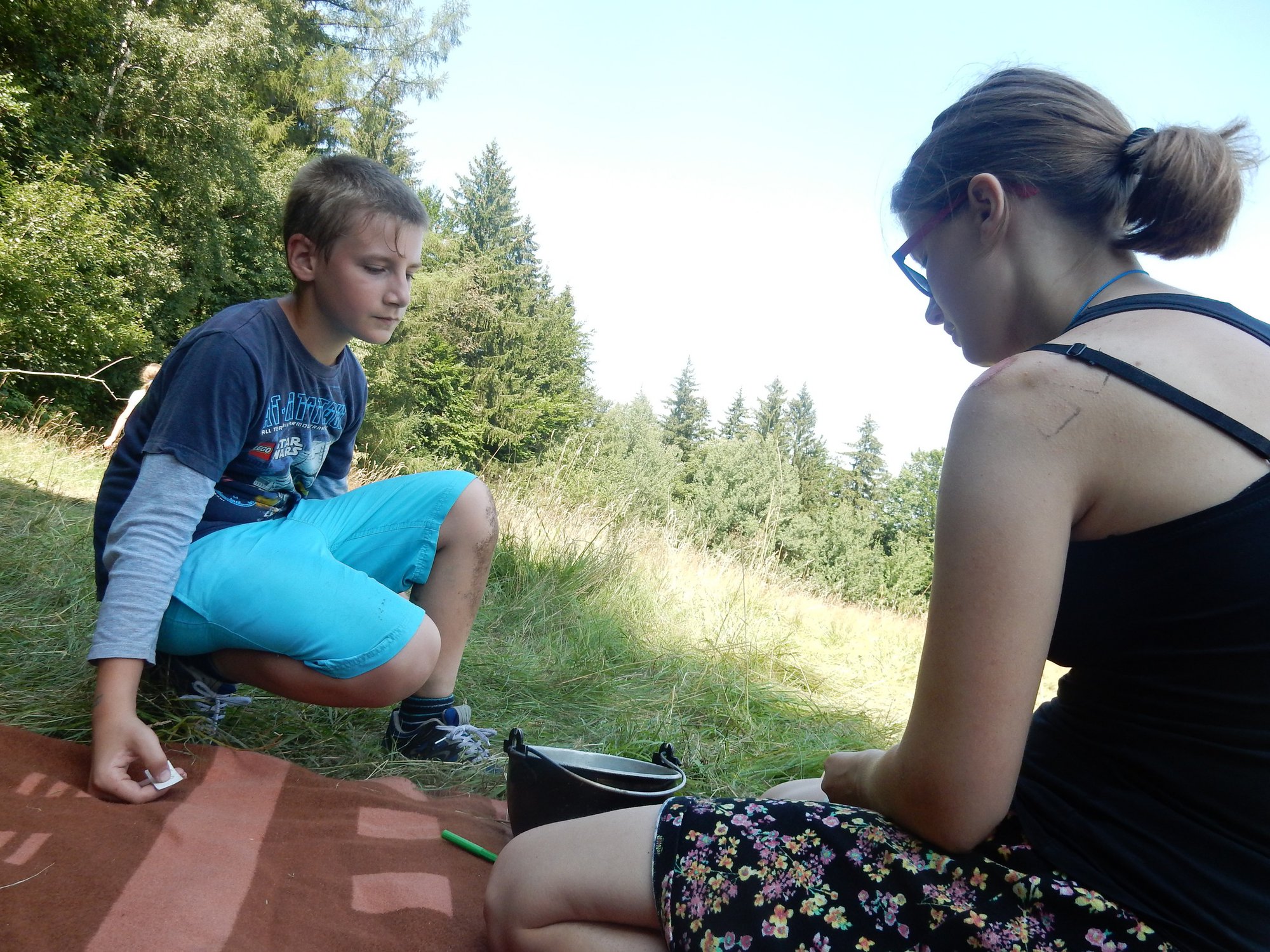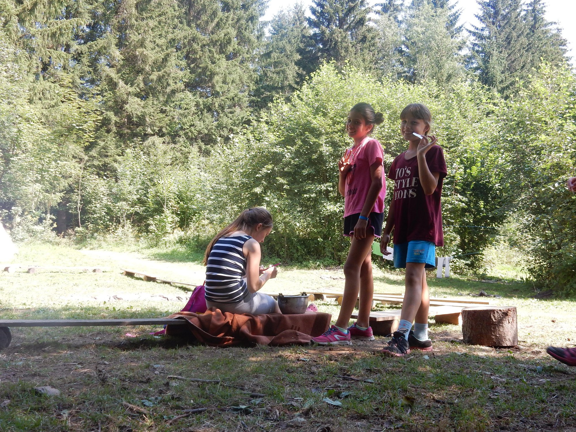 Ráno jsme poslali z každé party dvojici na pomoc kuchyni se škrábáním brambor (takže to po nás můžete chtít i doma :-)). Před svačinou jsme si zahráli po táboře rychlovku na otestování naší pozornost, jak si všímáme věcí po táboře. Na nástupu jsme se dozvěděli, že při dopravě zboží do našich osad škodí neznámě tlupy banditů. Museli jsme napnout všechny síly a pomoci dopravit zboží do určených míst. Hrálo se v celém širokém okolí tábora. Aby to nebylo tak jednoduché, cestou nás přepadávali bandité (naši vedoucí) a snažili se nás oloupit. I tak jsme přepravili úctyhodnou hromadu zboží. Z dřívějších her a výprav známe kdejakou cestičku a to nám dnes hodně pomohlo.