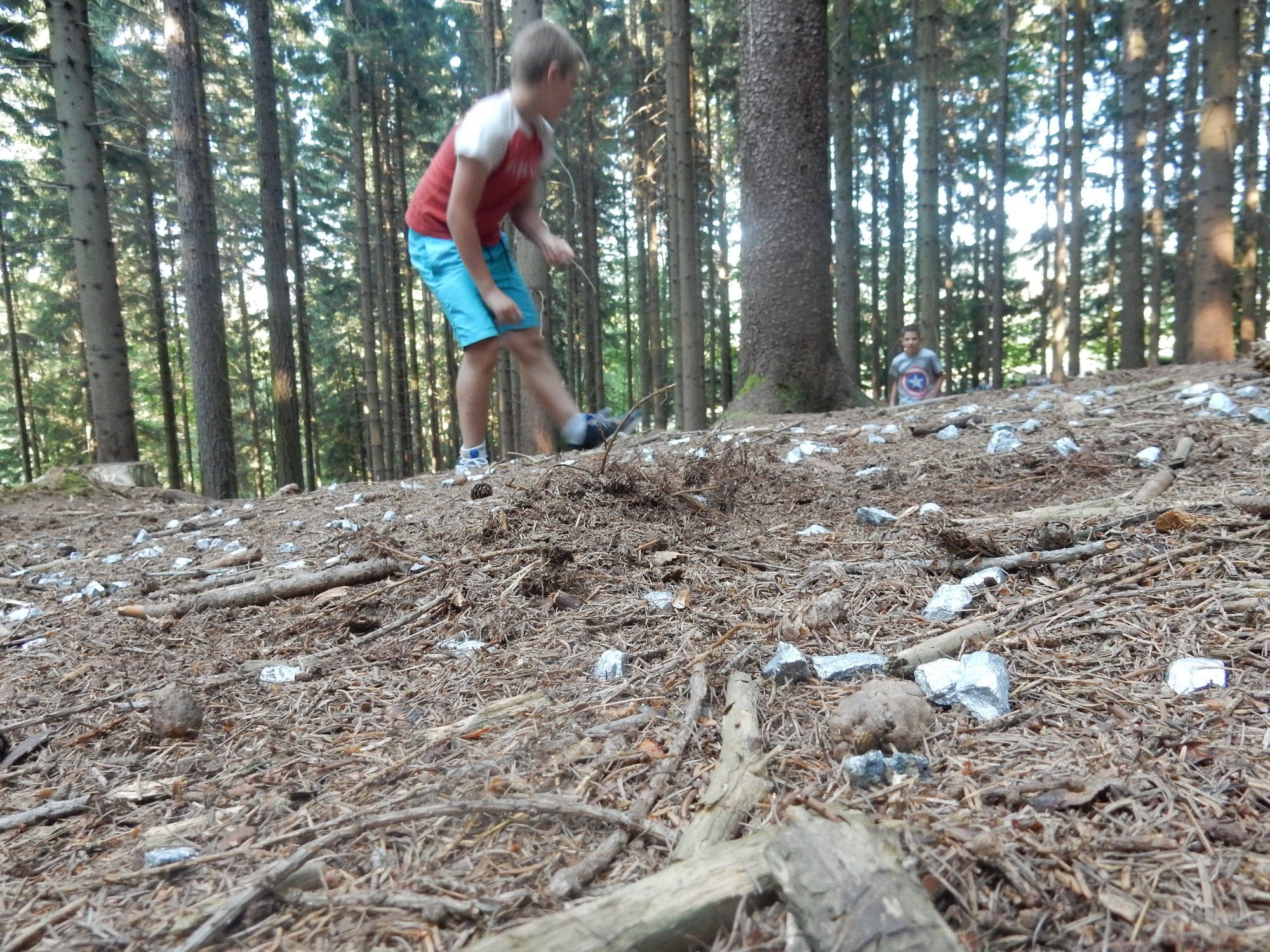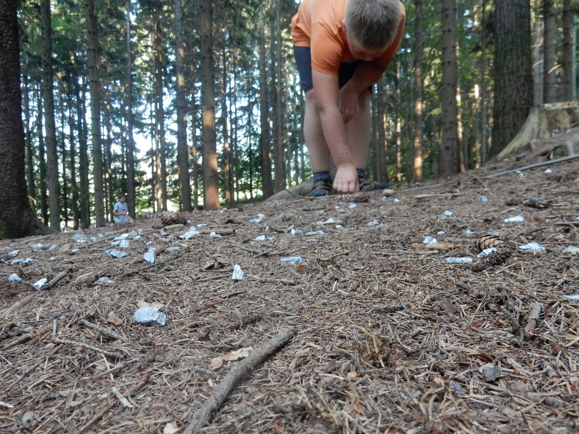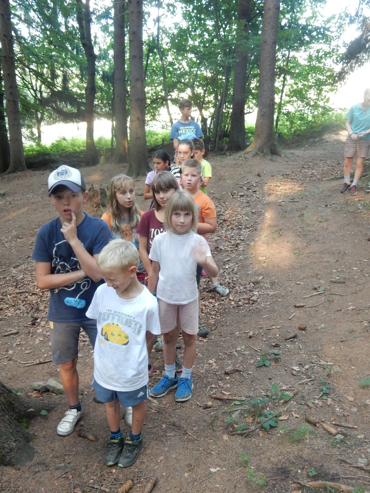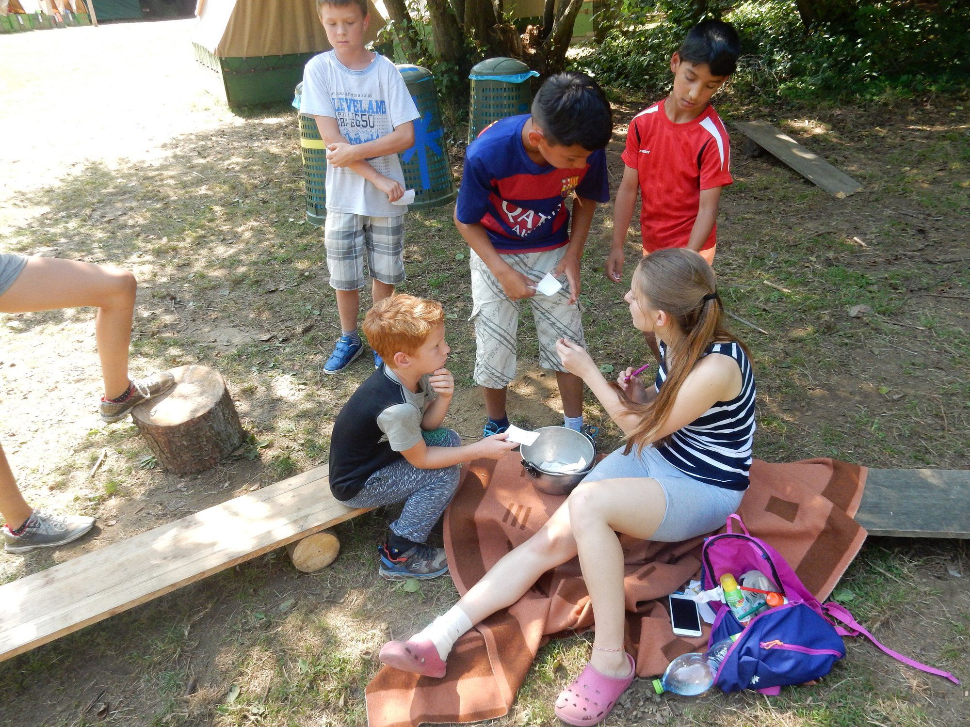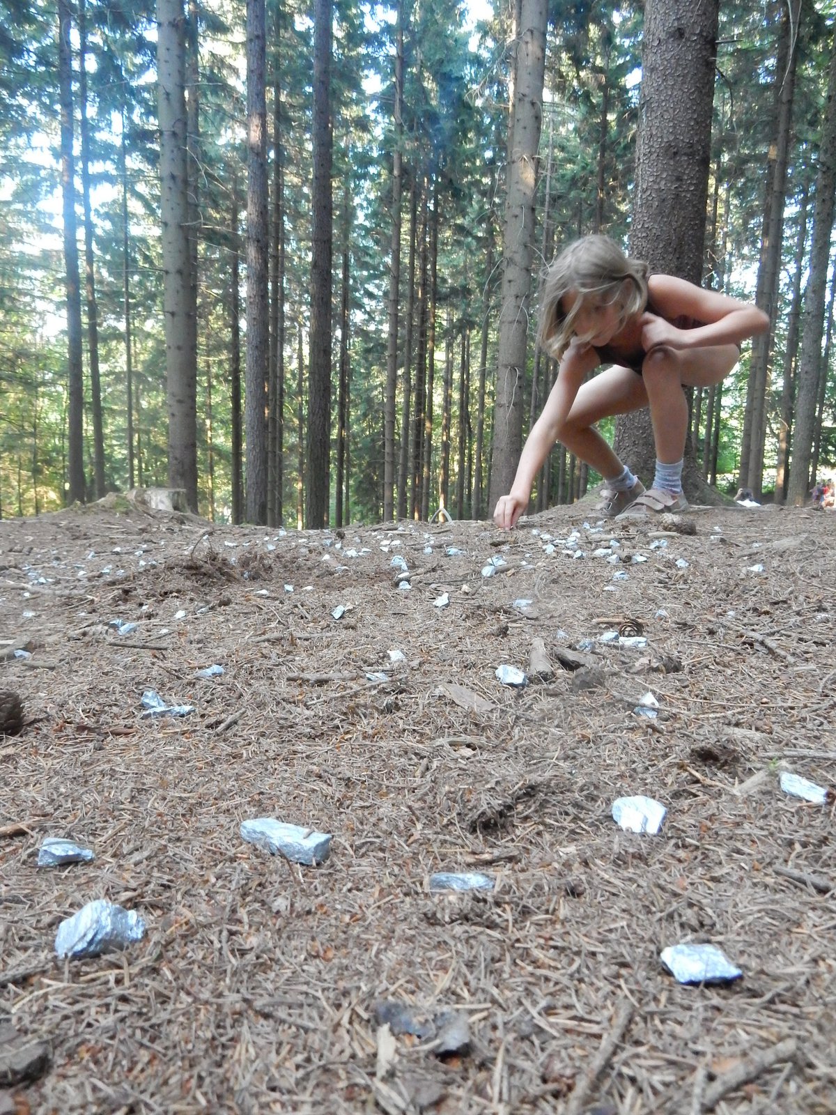 Ráno jsme poslali z každé party dvojici na pomoc kuchyni se škrábáním brambor (takže to po nás můžete chtít i doma :-)). Před svačinou jsme si zahráli po táboře rychlovku na otestování naší pozornost, jak si všímáme věcí po táboře. Na nástupu jsme se dozvěděli, že při dopravě zboží do našich osad škodí neznámě tlupy banditů. Museli jsme napnout všechny síly a pomoci dopravit zboží do určených míst. Hrálo se v celém širokém okolí tábora. Aby to nebylo tak jednoduché, cestou nás přepadávali bandité (naši vedoucí) a snažili se nás oloupit. I tak jsme přepravili úctyhodnou hromadu zboží. Z dřívějších her a výprav známe kdejakou cestičku a to nám dnes hodně pomohlo.