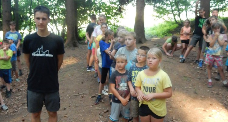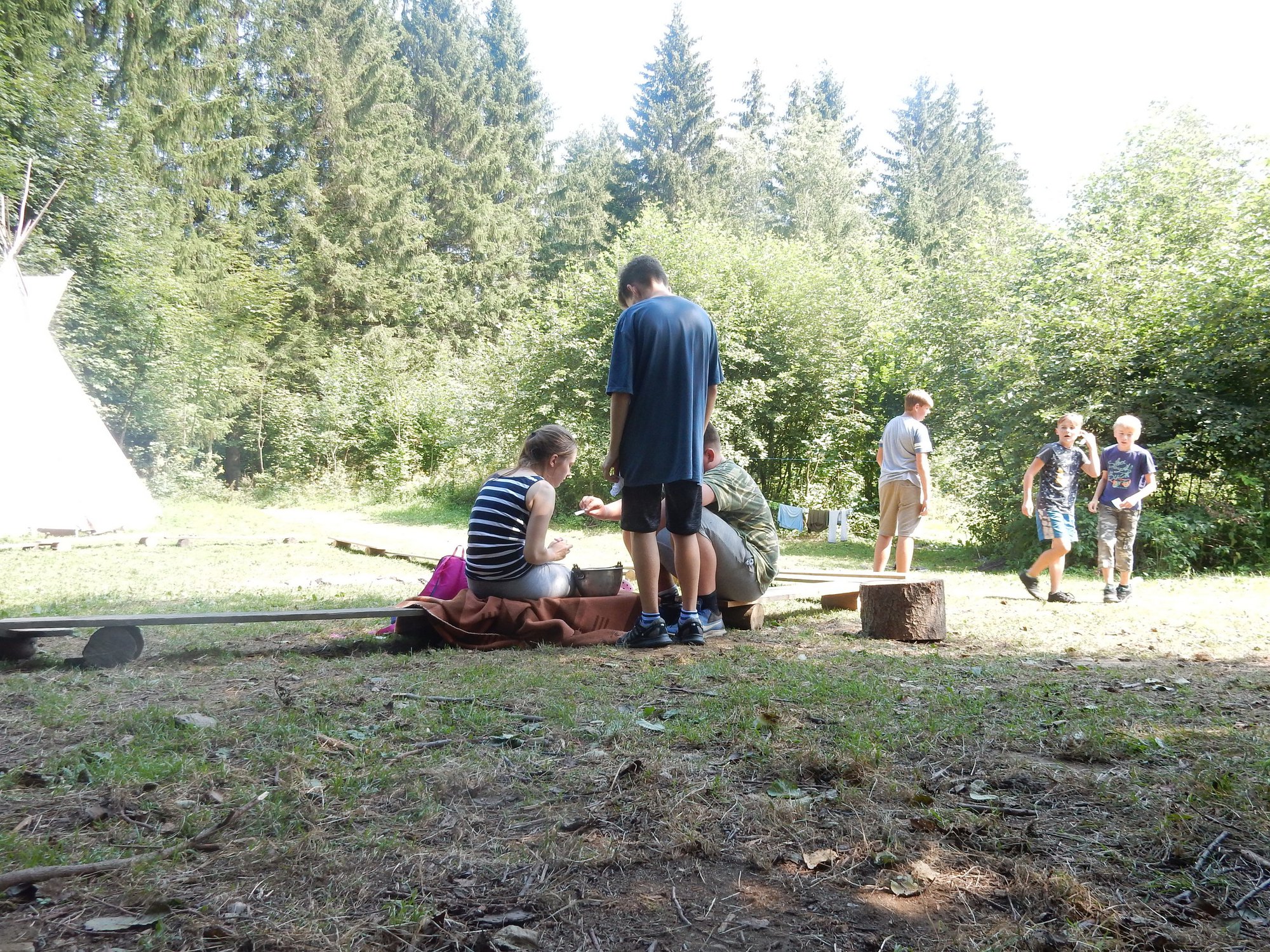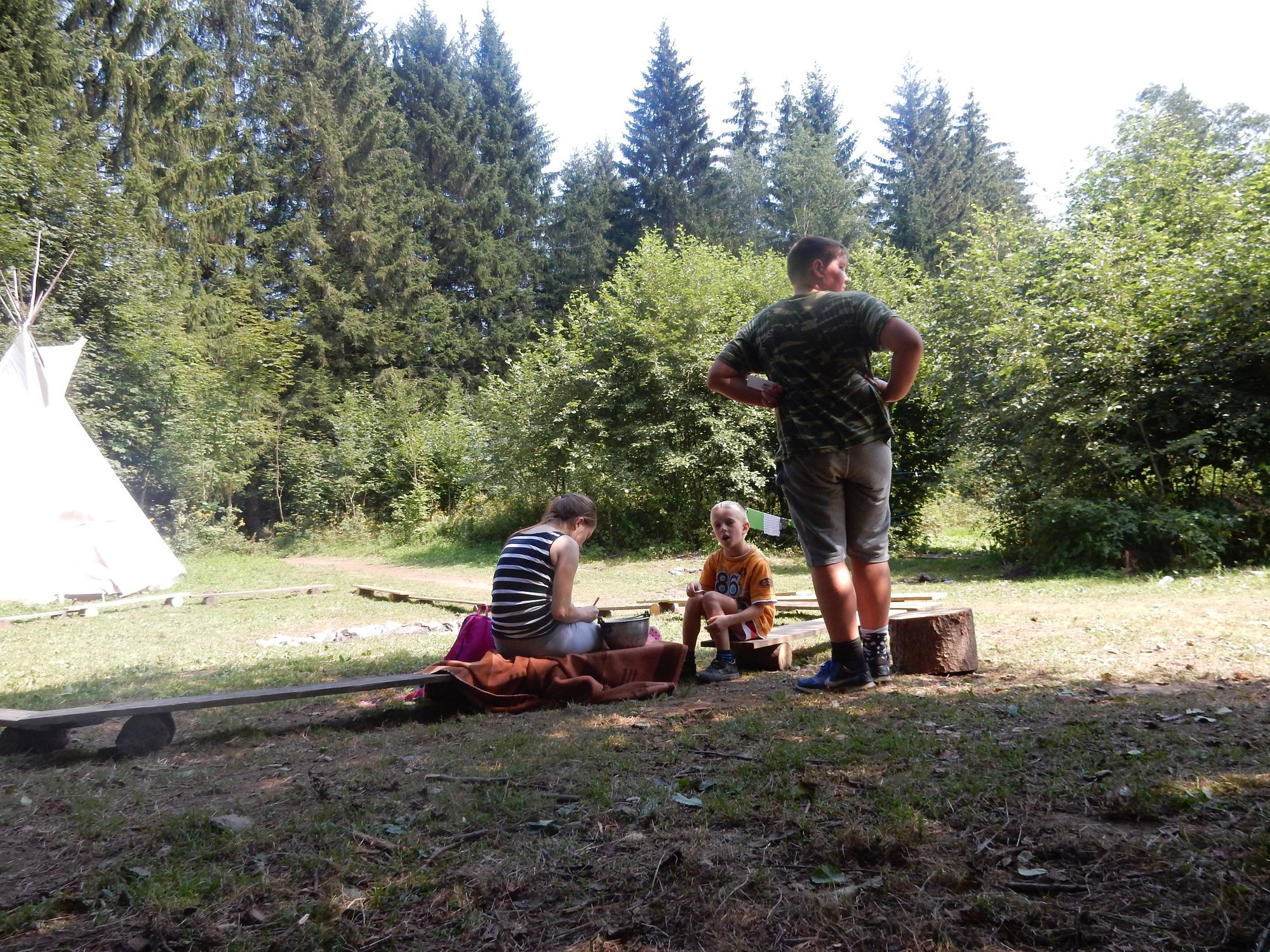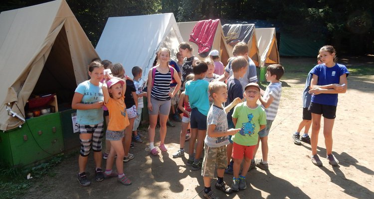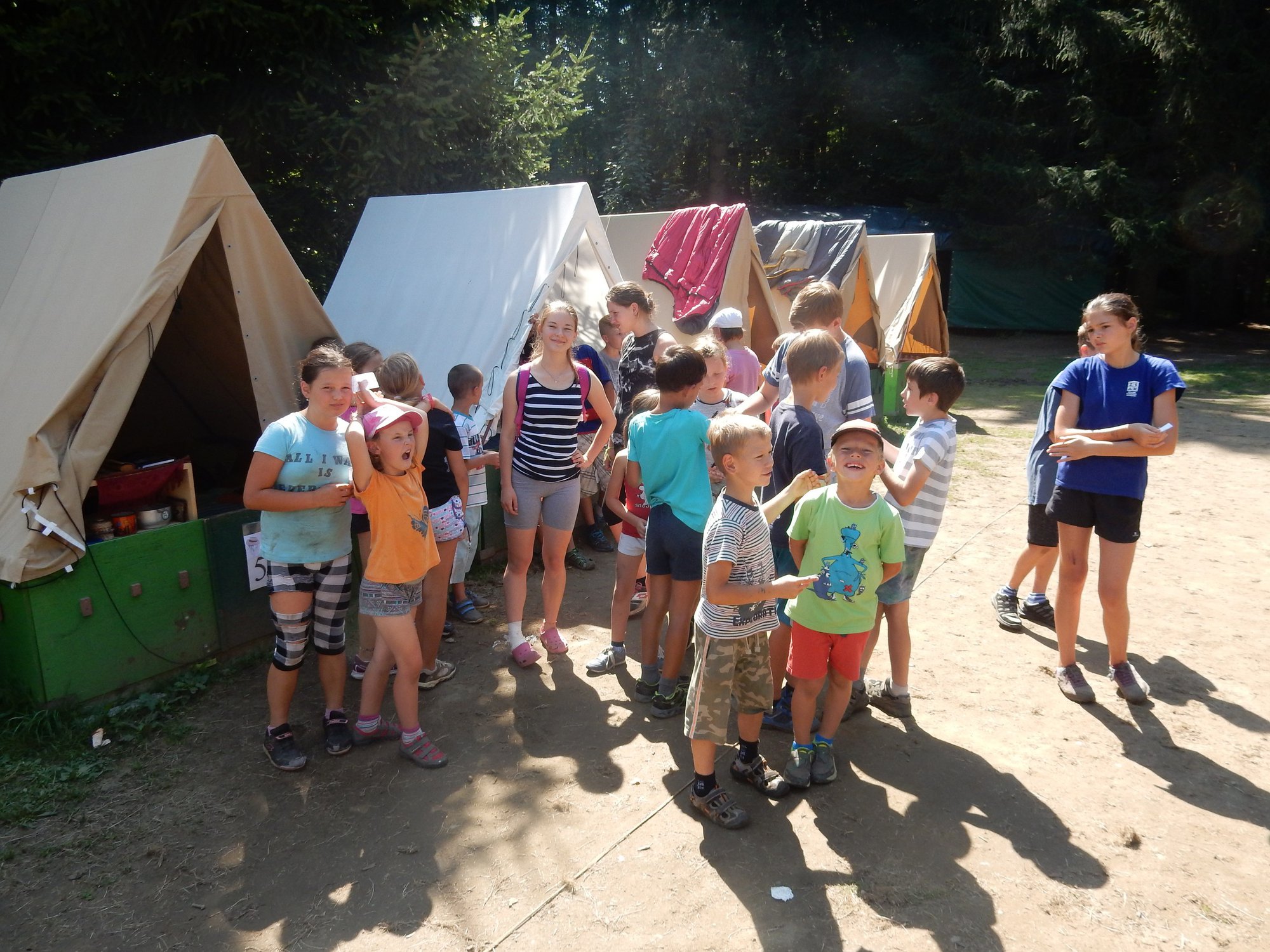 I dnes jsme se šli po poledním klidu vykoupat, i když teploty jsou „u nás v lese“ o pár stupňů nižší než „u vás v civilizaci“. Po svačině jsme se vydali dobývat poklad schovaný ve starém indiánském pueblu. Aby to nebylo tak jednoduché, museli jsme se vyhýbat dvěma bláznivým indiánům a svádět souboje s indiánskými hlídkami. Ale vše jsme zvládli a získali další vzácné kovy. Teď dojídáme večeři (rizoto) a do večerního nástupu si můžeme ještě sami mezi sebou něco zahrát.
