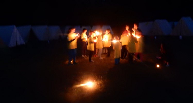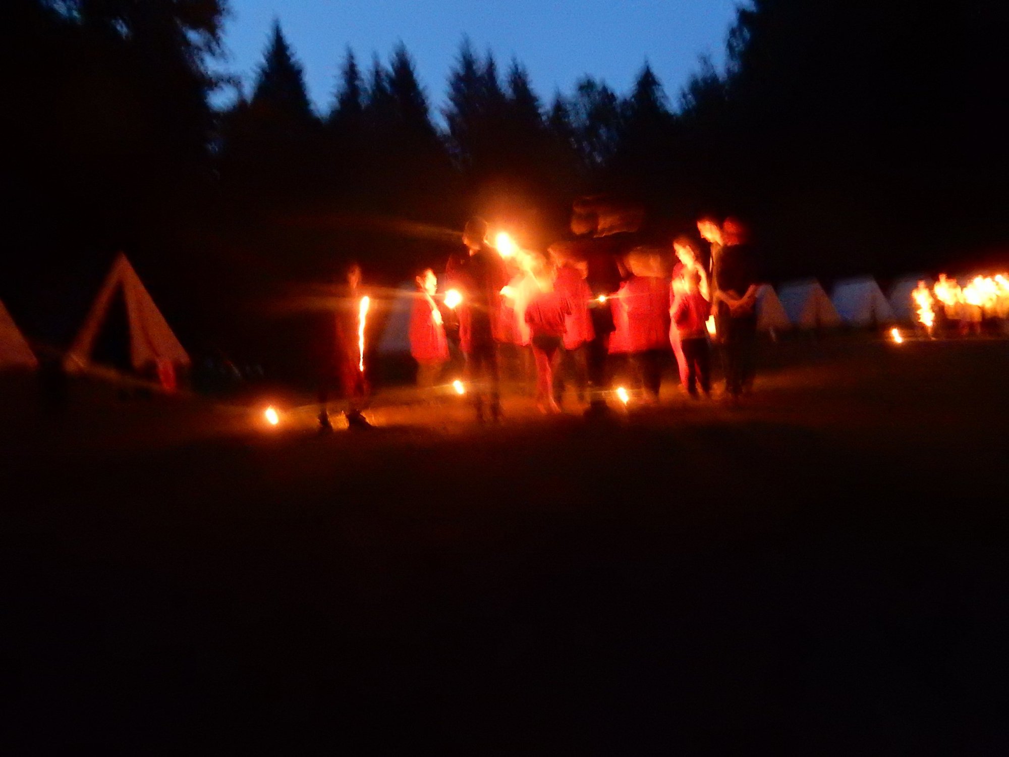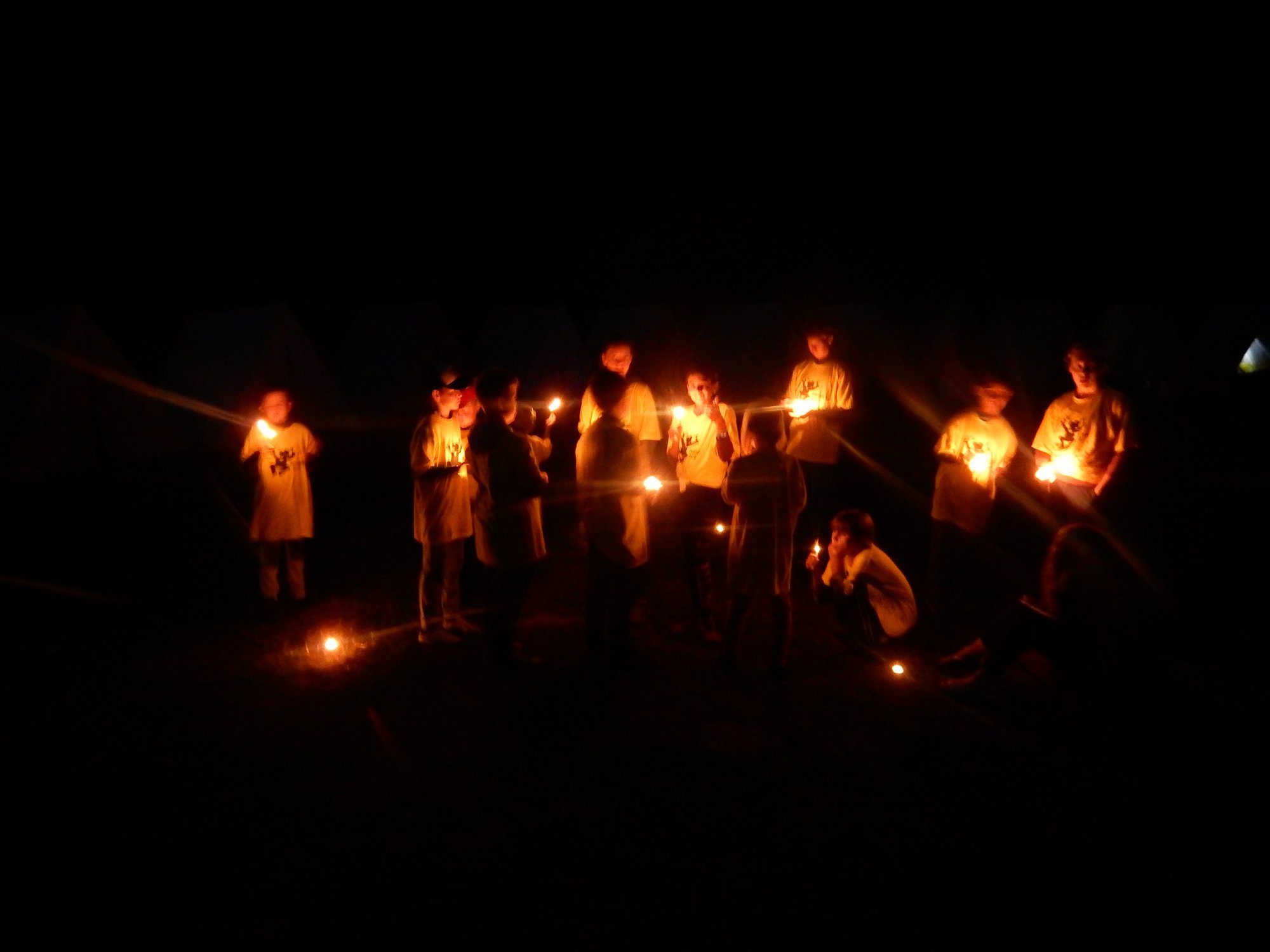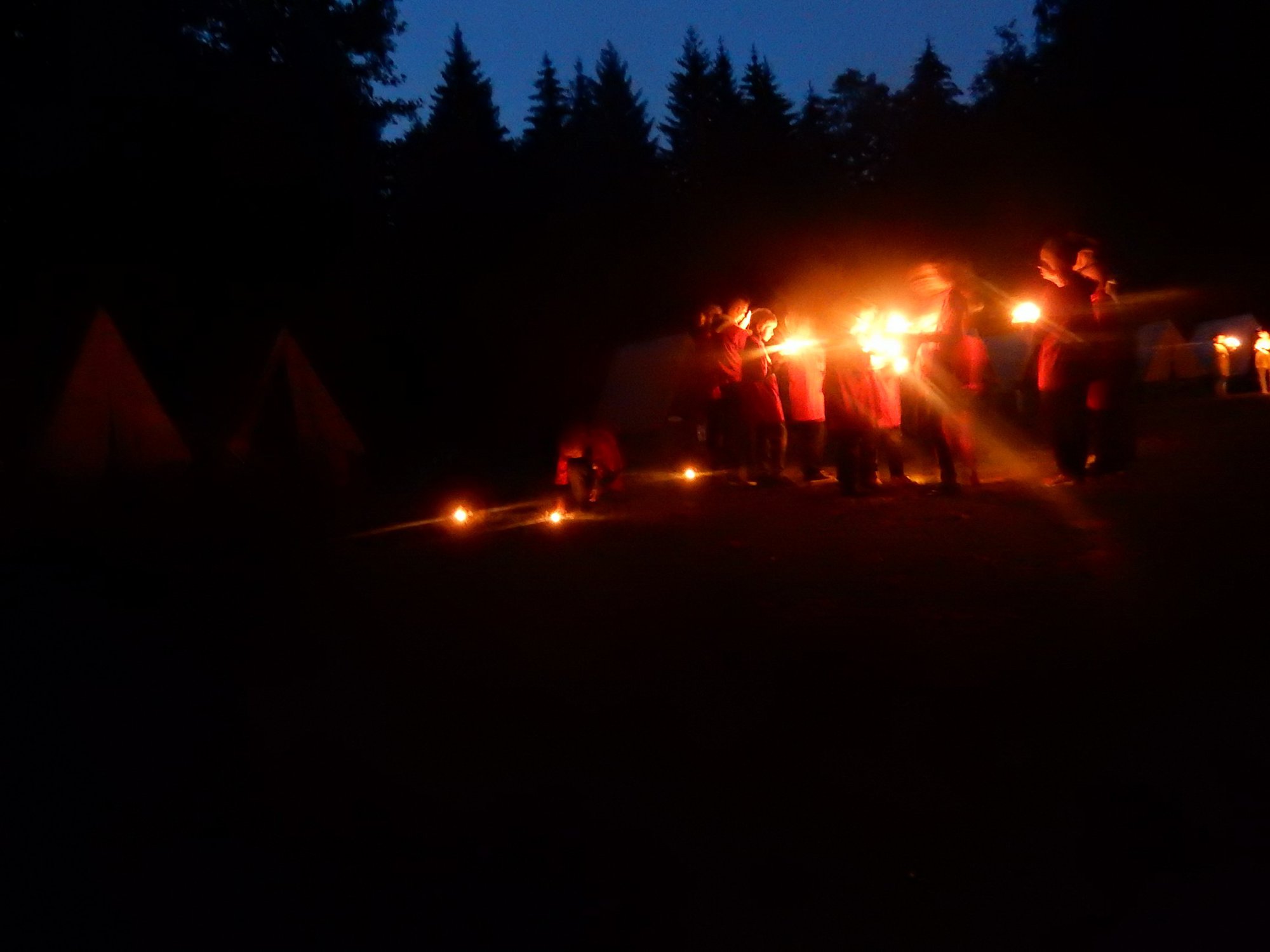 Po večerním nástupu už jsme se pomalu chystali spát, ale v tom přišel další nástup, tentokrát v oddílových barevných tričkách. V táboře vznikla tři hřiště na svíčkový fotbal a my jsme se dali do zápasů. Každý měl zapálenou dortovou svíčku a snažil se s ní projít skrz soupeřovu branku. Navzájem jsme si svíčky sfoukávali a tím bránili vlastní branku. Tím skončil dnešní den, těšíme se zítra !