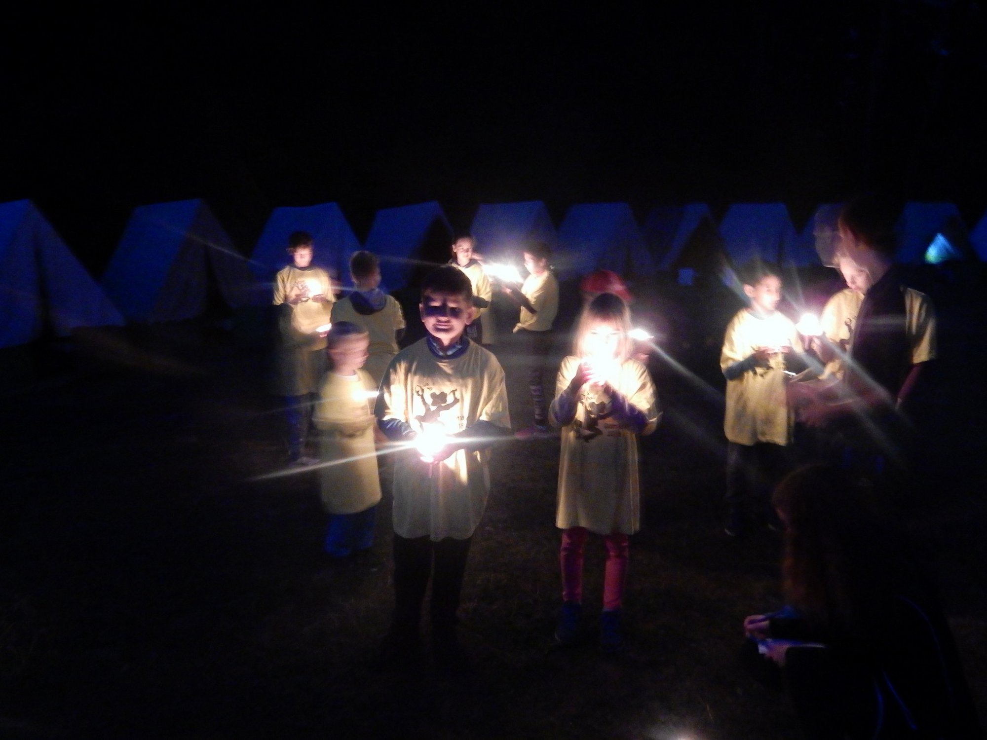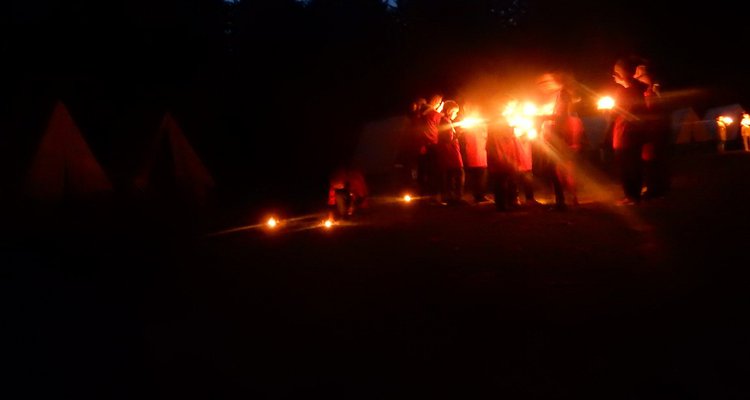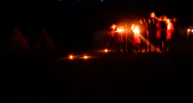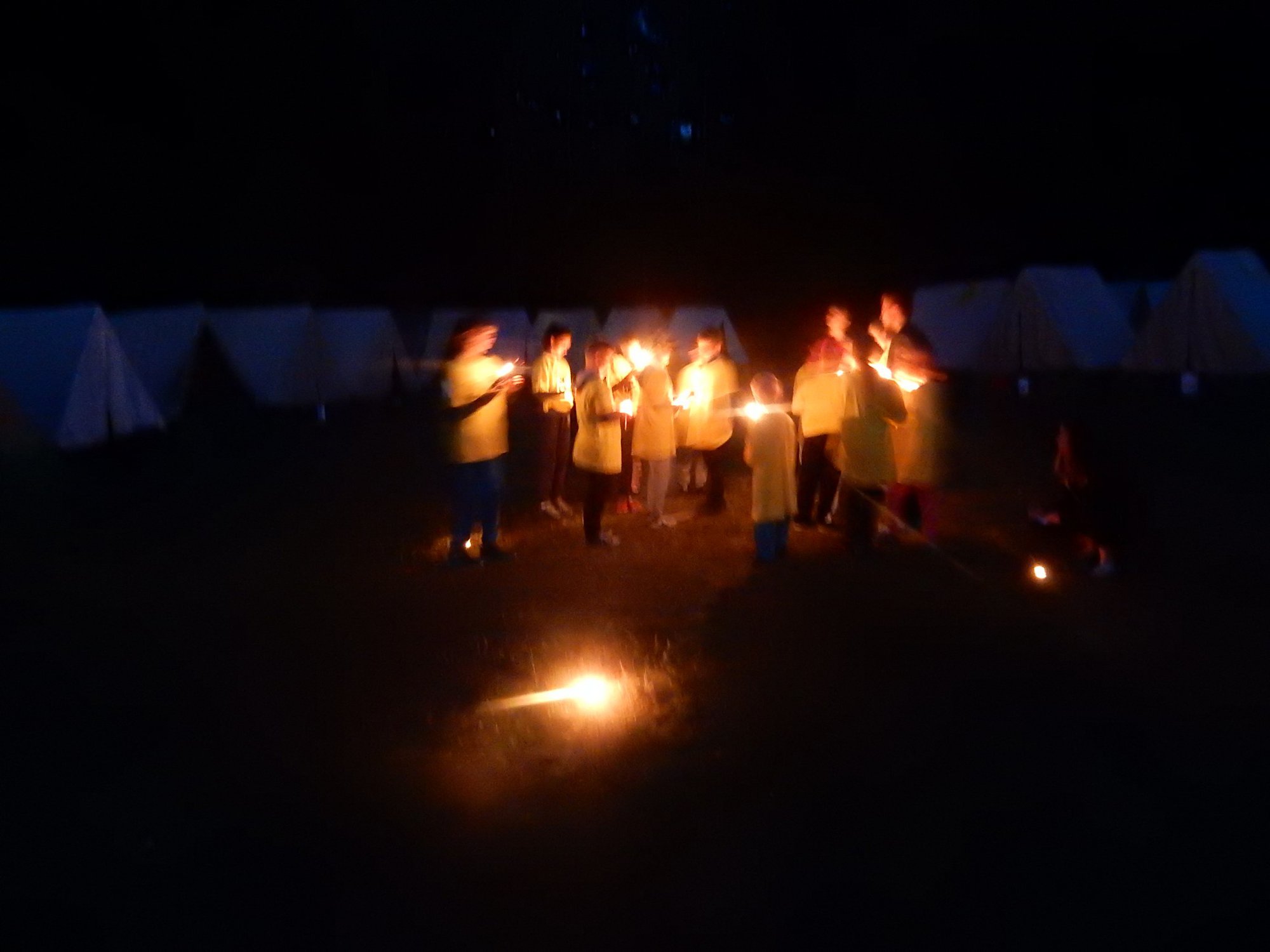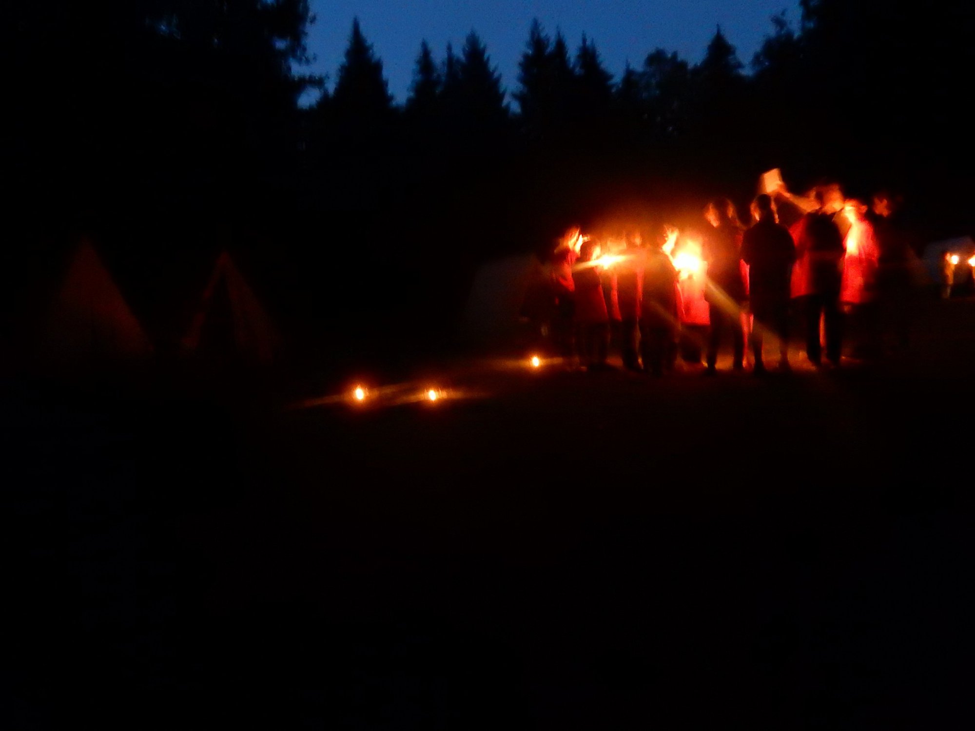 Po večerním nástupu už jsme se pomalu chystali spát, ale v tom přišel další nástup, tentokrát v oddílových barevných tričkách. V táboře vznikla tři hřiště na svíčkový fotbal a my jsme se dali do zápasů. Každý měl zapálenou dortovou svíčku a snažil se s ní projít skrz soupeřovu branku. Navzájem jsme si svíčky sfoukávali a tím bránili vlastní branku. Tím skončil dnešní den, těšíme se zítra !